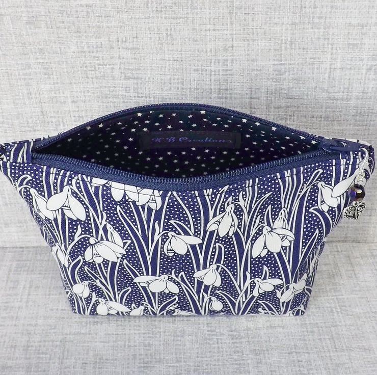 A medium sized make up bag/zipped pouch made from Liberty 'Hesketh House' quilting weight cotton in navy blue with a white snowdrop design. The lining fabric is a navy cotton poplin with a white star design on it..