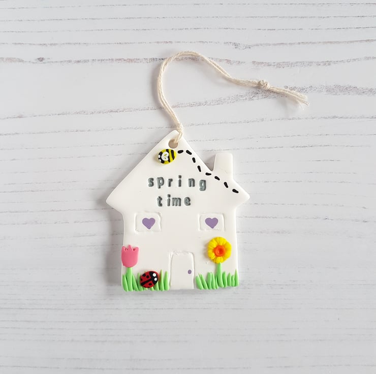 This little house shaped decoration is made of polymer clay, with SPRING TIME stamped by hand using mini individual letters, and detail hand painted using acrylic paint to finish. Also carefully crafted in clay and placed onto the decoration is a pink tulip, yellow daffodil, individual grass blades, a cute ladybird and a buzzing bee along the top! Finished off with some lilac hearts in the windows!