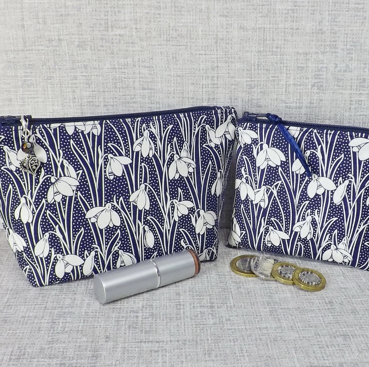A small coin purse made from Liberty 'Hesketh House' quilting weight cotton in navy blue with a white snowdrop design. The lining fabric is a navy cotton poplin with a white star design on it.