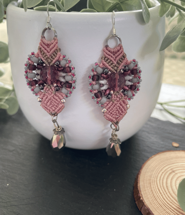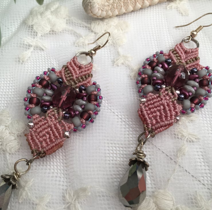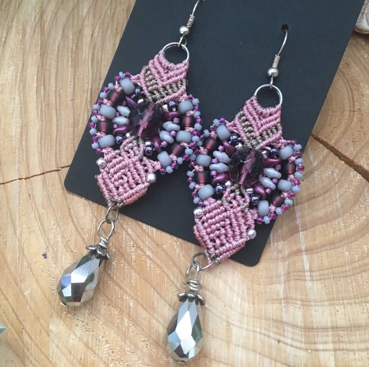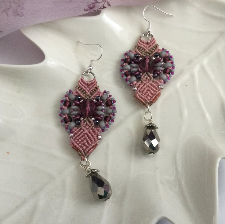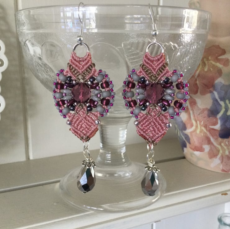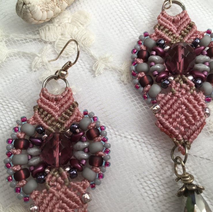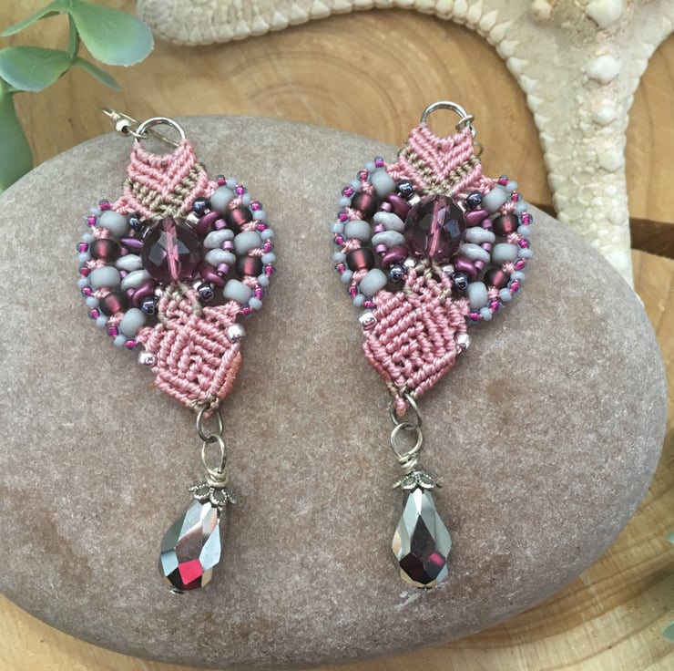 The design has been created using high quality, extremely strong S lon 0.5mm macrame thread, in soft pink. I have threaded a selection of Japanese and Czech glass seed beads around a central purple Fire Polished bead, giving the effect of a flower.