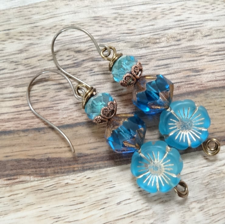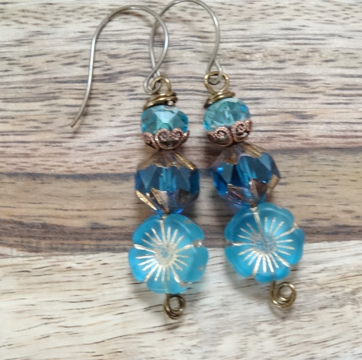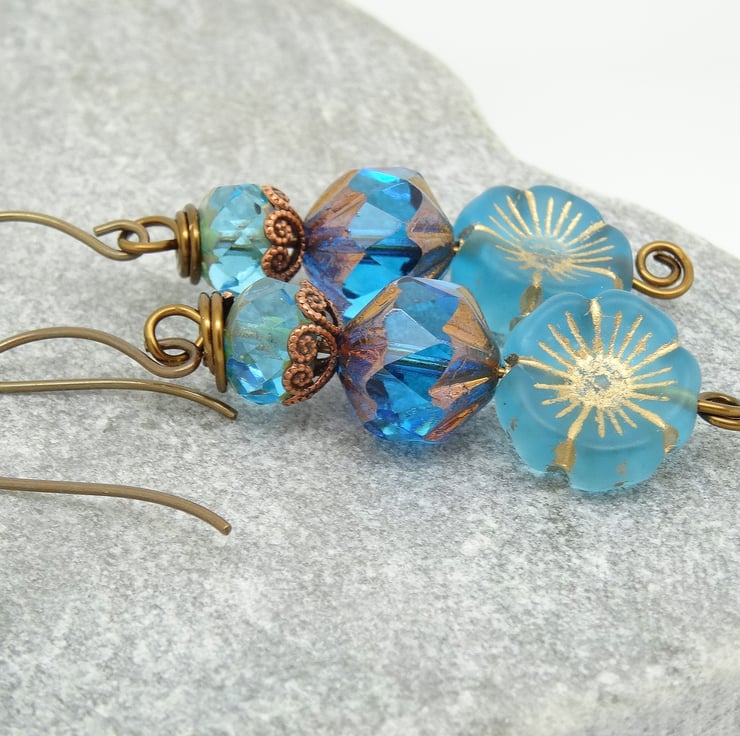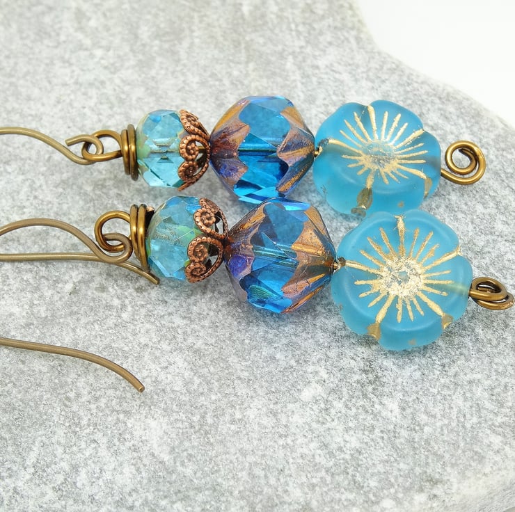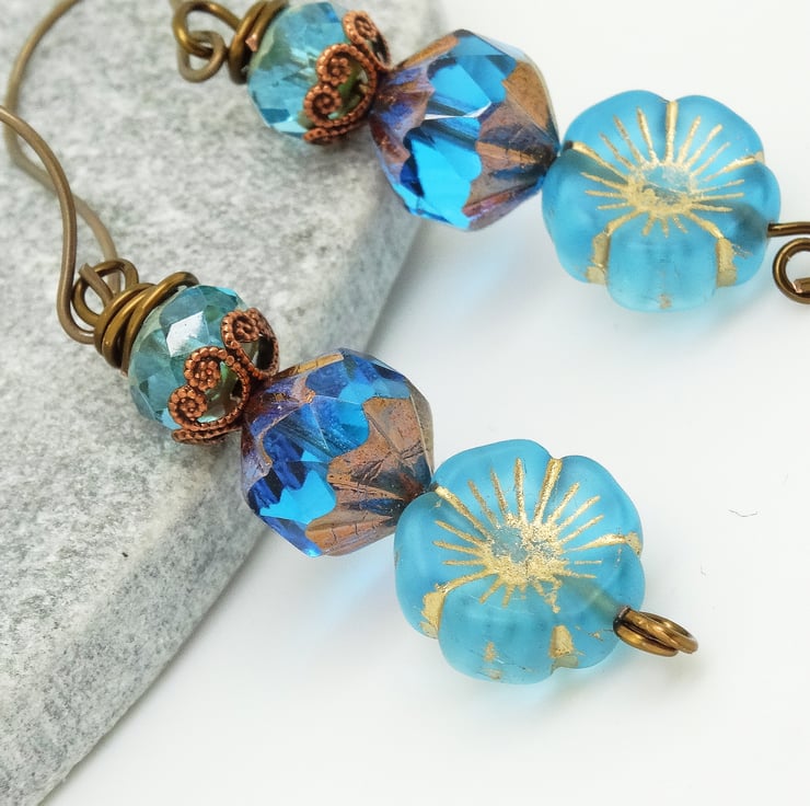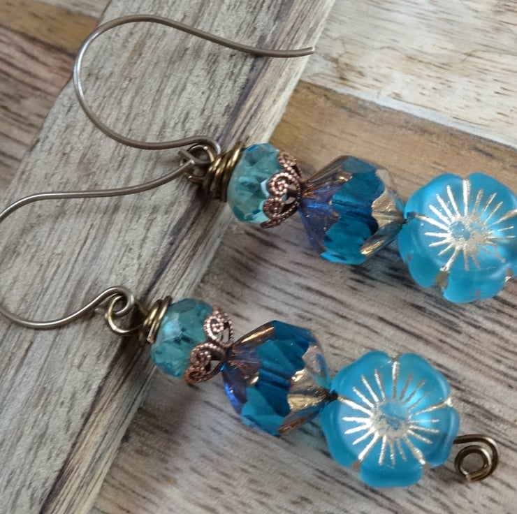 These earrings are just adorable and so pretty. I have made them using 14mm pansy flower beads with a gold centre, 12mm bicone beads in a most vivid aqua blue with bronze fluted edges, 9 x 6mm Czech glass faceted bicone beads which I have cupped with copper filigree bead caps. The earrings measure 2.25 inches (6cm) from top of vintaj brass, nickel free, round loop ear wires.