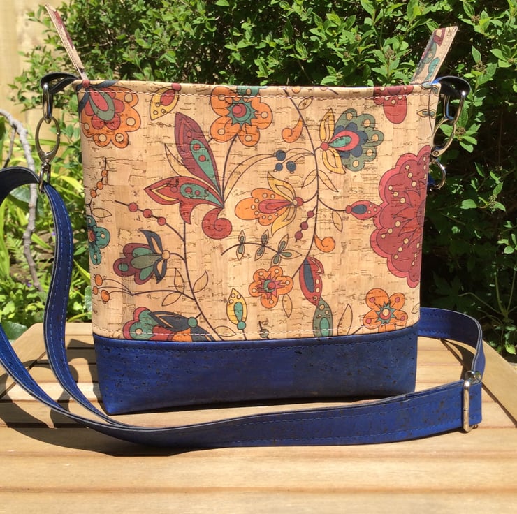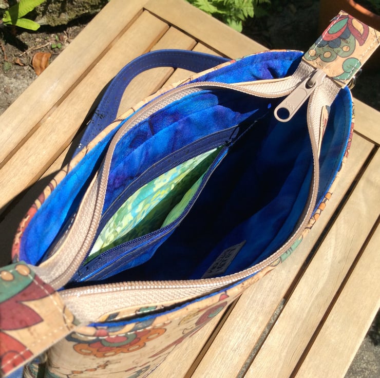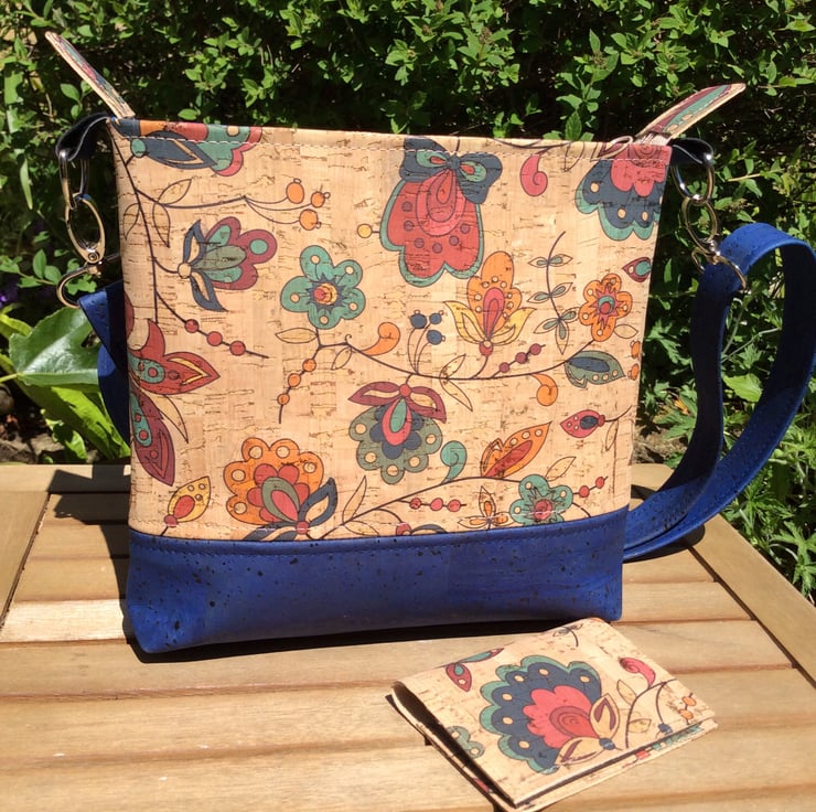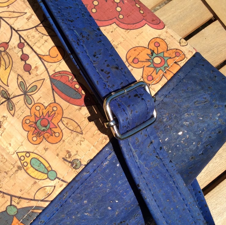 The outer features a multicoloured floral print on natural cork with a contrasting dark denim blue base and strap. It is lined with a batik print cotton in gorgeous blue shades with a contrasting green batik pocket lining.