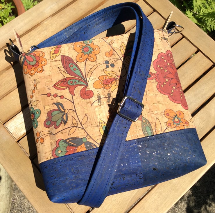 A shoulder or crossbody handbag handmade from my own design in Amazon flowers print cork fabric and fully lined with cotton fabric. It has a zip closure and an inner zip pocket. The generous strap is adjustable allowing the bag to be worn as a cross body or shoulder bag.