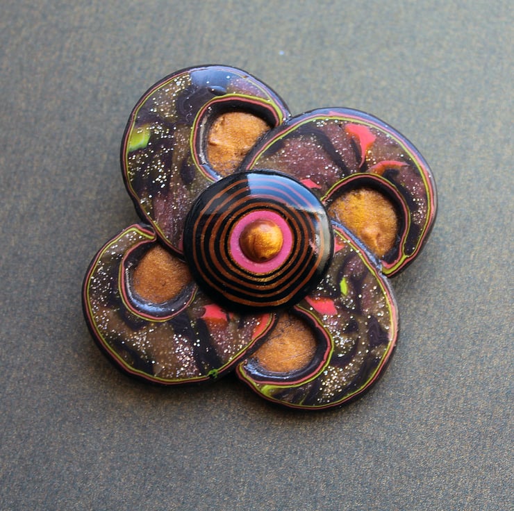 Crafted by myself from polymer clay - finished and polished to a fine degree with a metal pin securely attached. It measures 5cm (2") across.