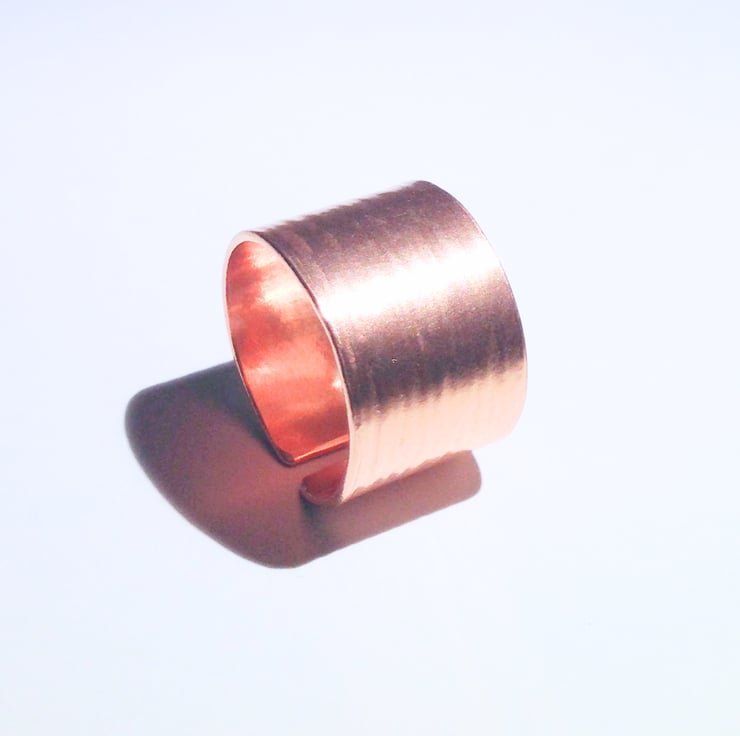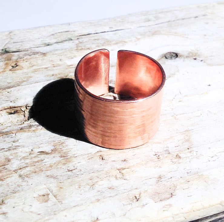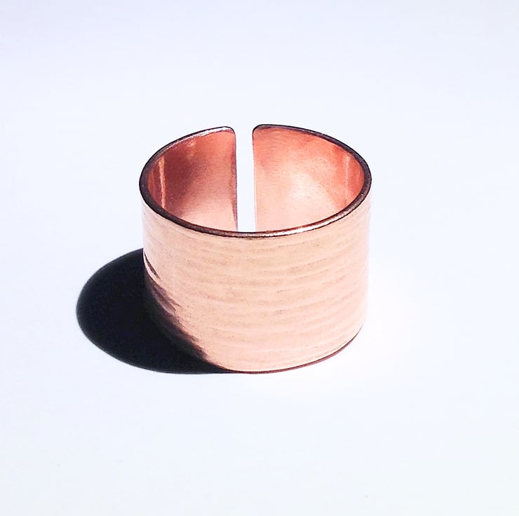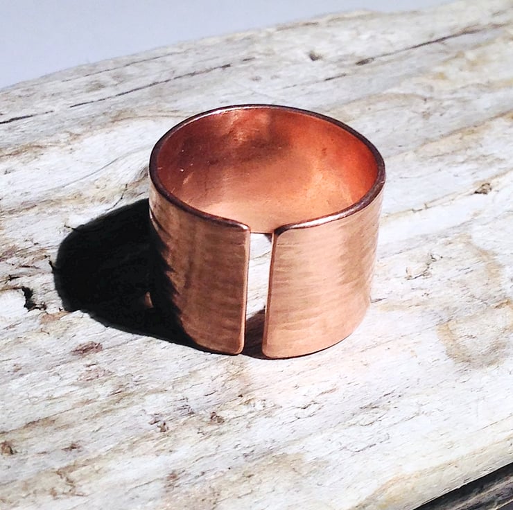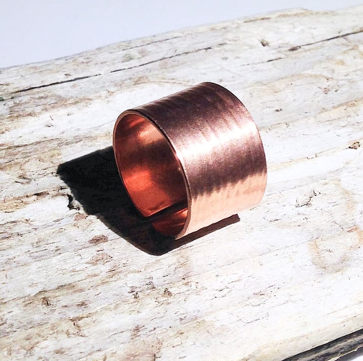 This beautiful ring is hand forged from sheet copper. It has been given an attractive hammer textured finish and polished.