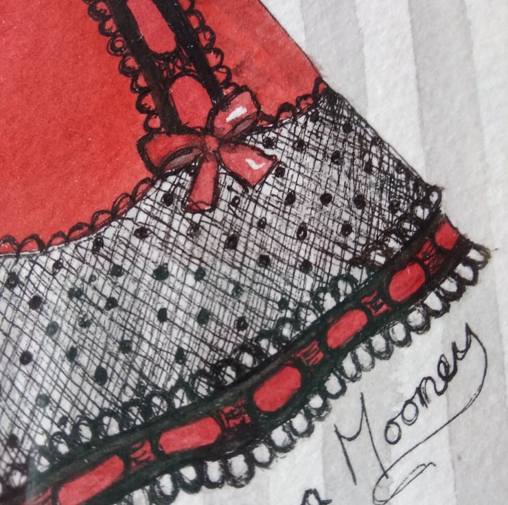 This is an original watercolour bra and knickers painting in sexy red and black. The design features a red bra with rows black painted ribbon and bows which also form the main part of the knickers. the top section of the bra has a black spotted net detail and side panel. This is also painted on the bottom section of the knickers. It stands out against a grey striped background. Red and black lingerie is always a glamorous, sexy look, don't you think. The artwork is from my 'Lingerie Collection created at my Norfolk studio. I hope it will add a little drama to your room. The painting is mounted, lime-washed framed in wood and ready to hang. The collection has such personality I had to give them names. I called this one 'Red Ribbon'.