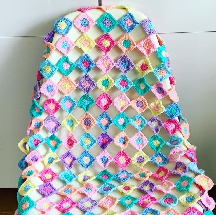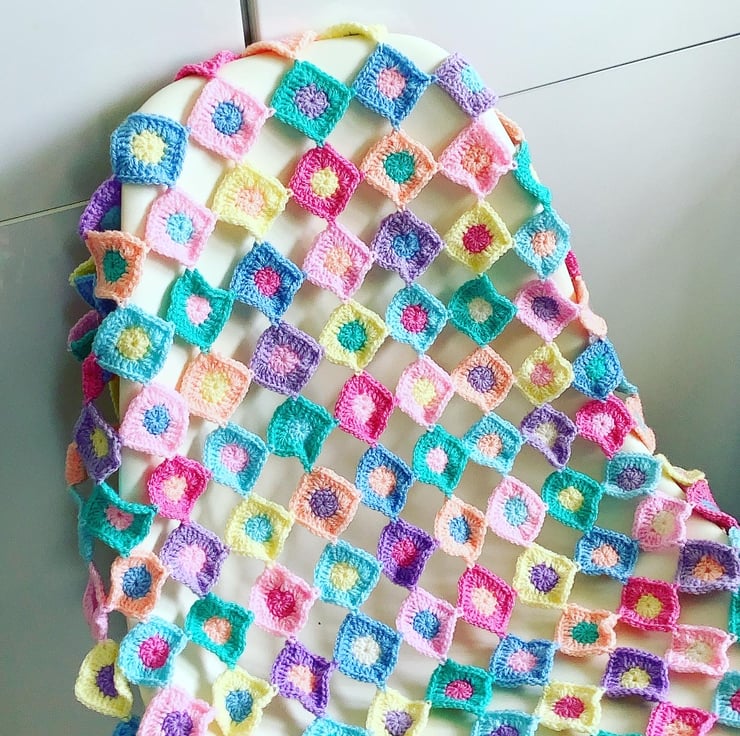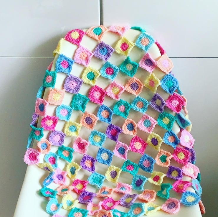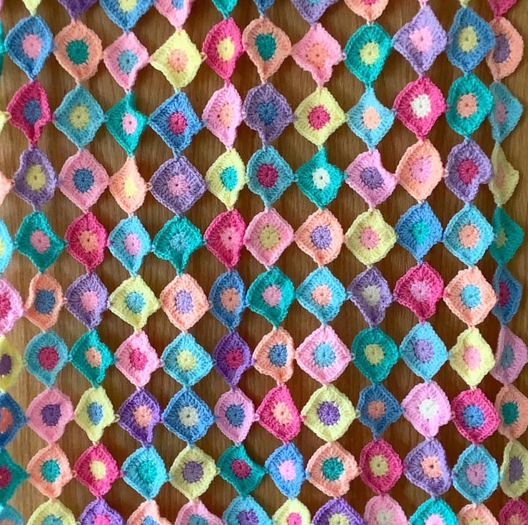 It has been made with good quality yarn and consists of circles surrounded with small granny squares. They are offset to produce a different look. The colours really pop with lots of pastel shades.