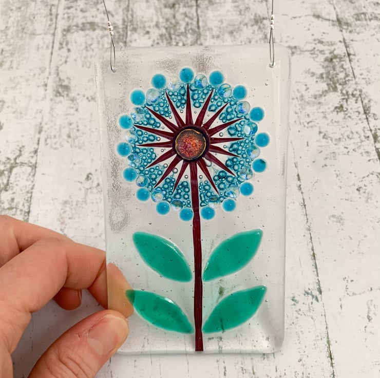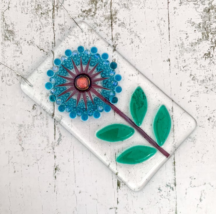 Fused glass hanging allium inspired suncatcher, in shades of blue and turquoise with lovely emerald coloured leaves. This would make a beautiful gift for a special friend and looks lovely in a window.