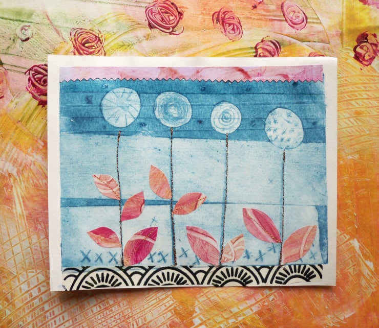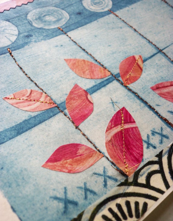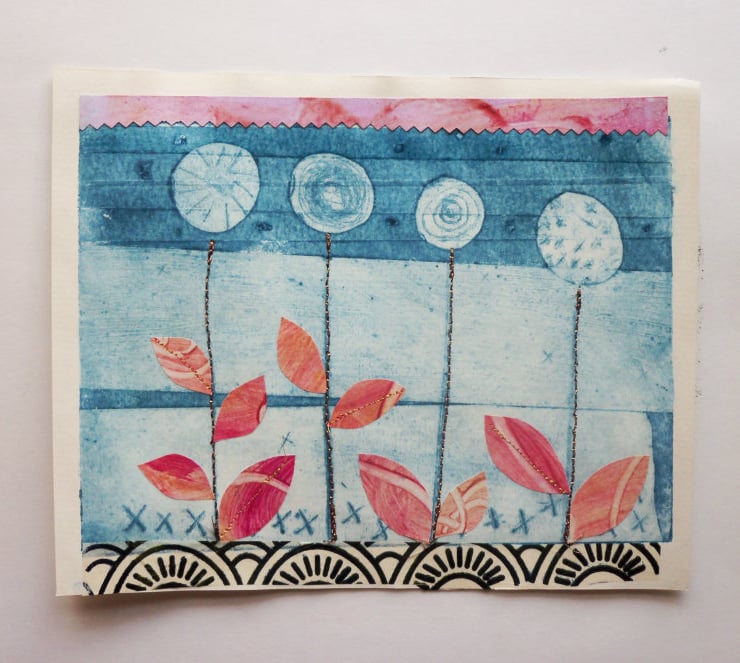 The main blue area of this piece is an original collagraph. I have then collaged some of my screen printed imagery and sewn directly onto the piece with gold coloured thread.