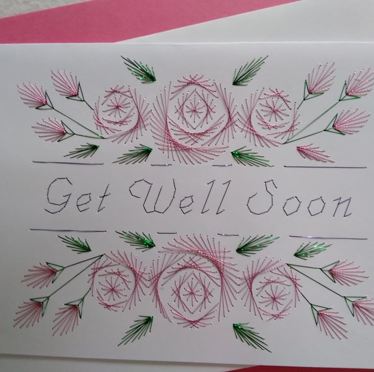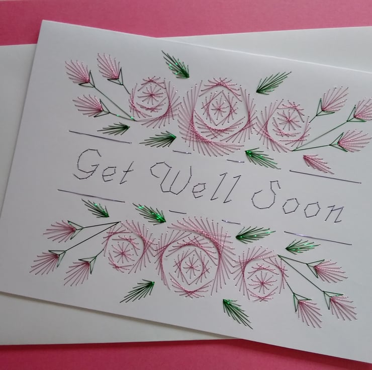 A lovely get well card, Hand Embroidered with pink, green and mauve metallic thread on a white card. The pink insert has been left blank for your own message.