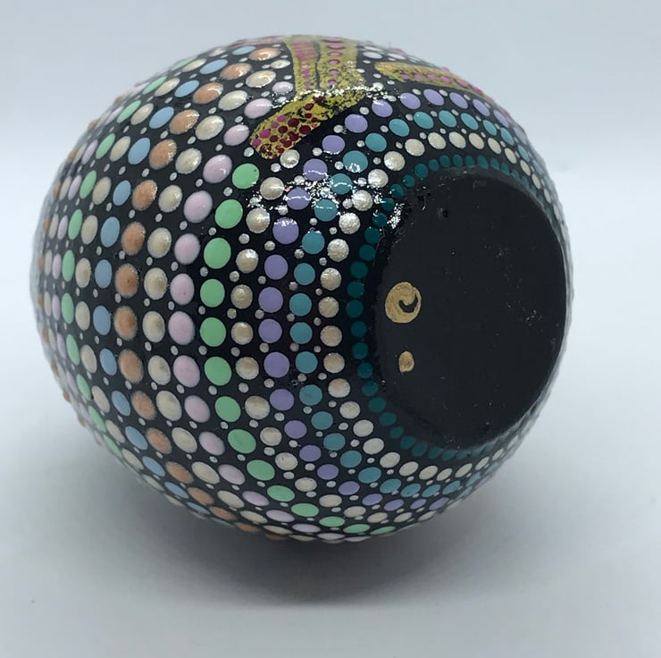 A golden rabbit, painted in folk art style and decorated with pink mandalas to symbolise circles of life. I hope this unique hand painted egg will be treasured as a special and original gift, perhaps for Easter, perhaps for a newborn infant, or perhaps for any occasion. I have signed the base with my mark “.o”