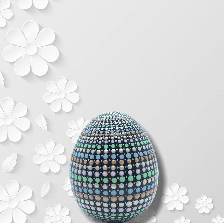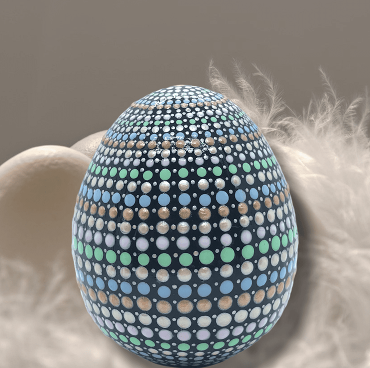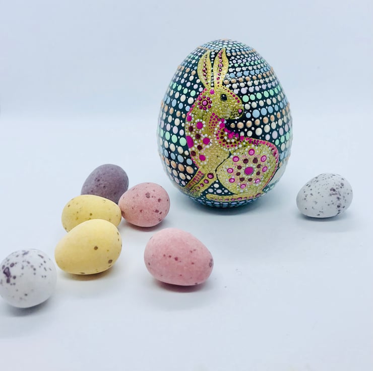 About the size of a hen’s egg, 5cm high this freestanding flat-bottomed egg is made of very hard wearing plaster and painted in dotted style, featuring a golden rabbit on one side. It has been varnished in two coats of varnish to protect from UV and dust, and has a subtle sheen.