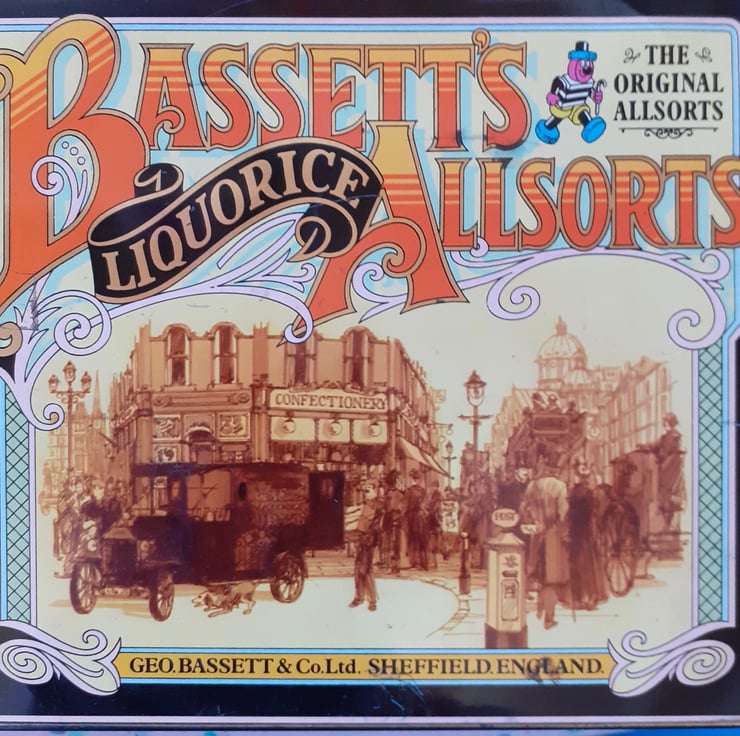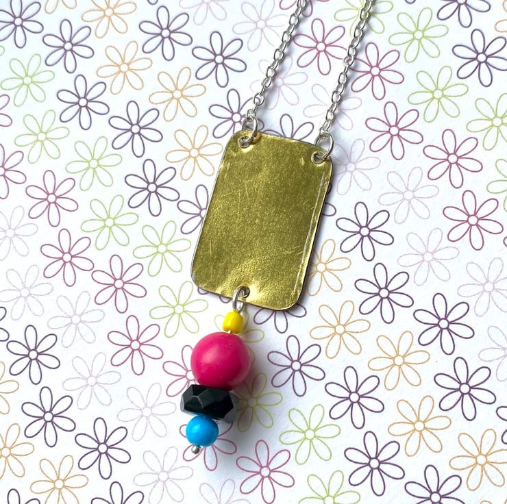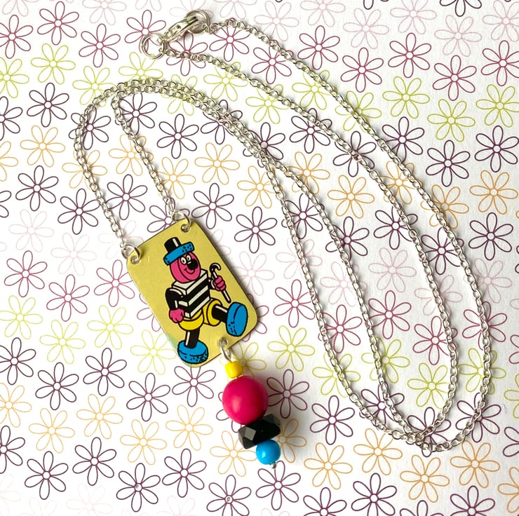 How cute is this little Bertie Bassett?! Cut from a vintage Bassett’s Liquorice Allsorts tin and smoothed around the edges, with the addition of glass and howlite beads which replicate the colours and shapes of the sweets themselves!