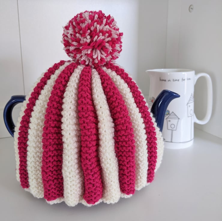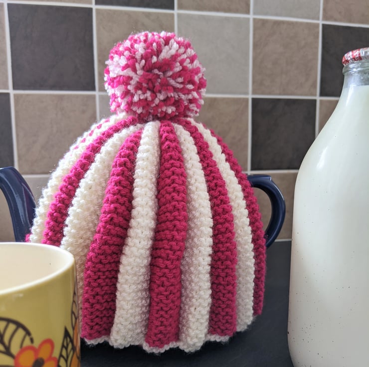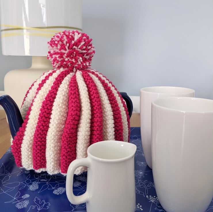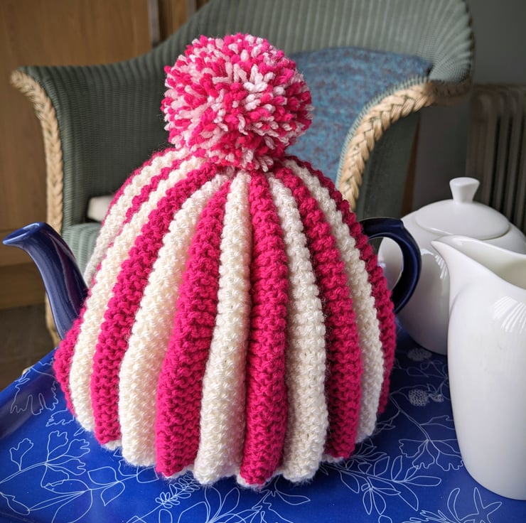The pleated design creates a lovely, almost padded cosy, in eye-catching pink and white stripes.