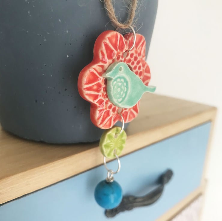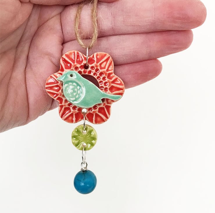 This titchy little pottery bird decoration is made from white earthenware clay and glazed in a rich, glossy glazes. You could use it as a hanging decoration or you could use one of your own chains and wear it as a pendant. It will come with a brown string (necklace not supplied). It measures 4.5cm diameter x 7cm long x 1cm deep. Decorated on the front only.