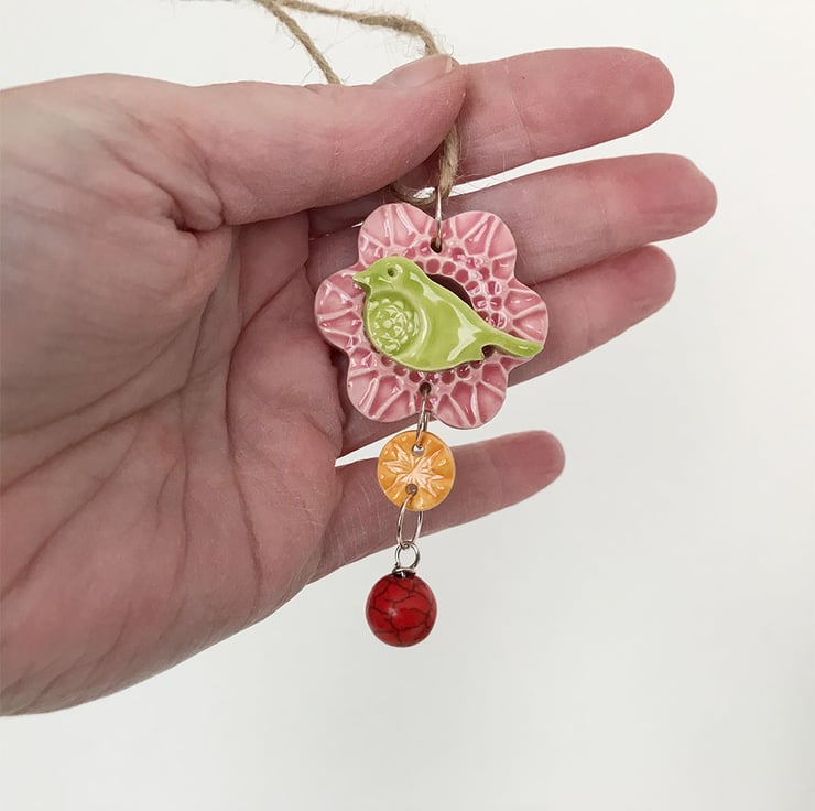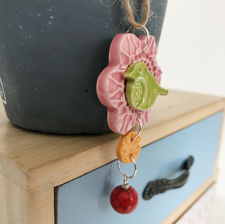 This titchy little pottery bird decoration is made from white earthenware clay and glazed in a rich, glossy glazes. You could use it as a hanging decoration or you could use one of your own chains and wear it as a pendant. It will come with a brown string (necklace not supplied). It measures 4.5cm diameter x 7cm long x 1cm deep. Decorated on the front only.