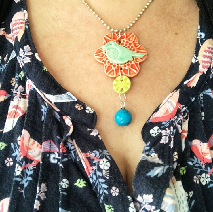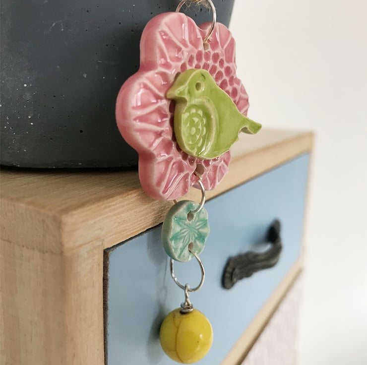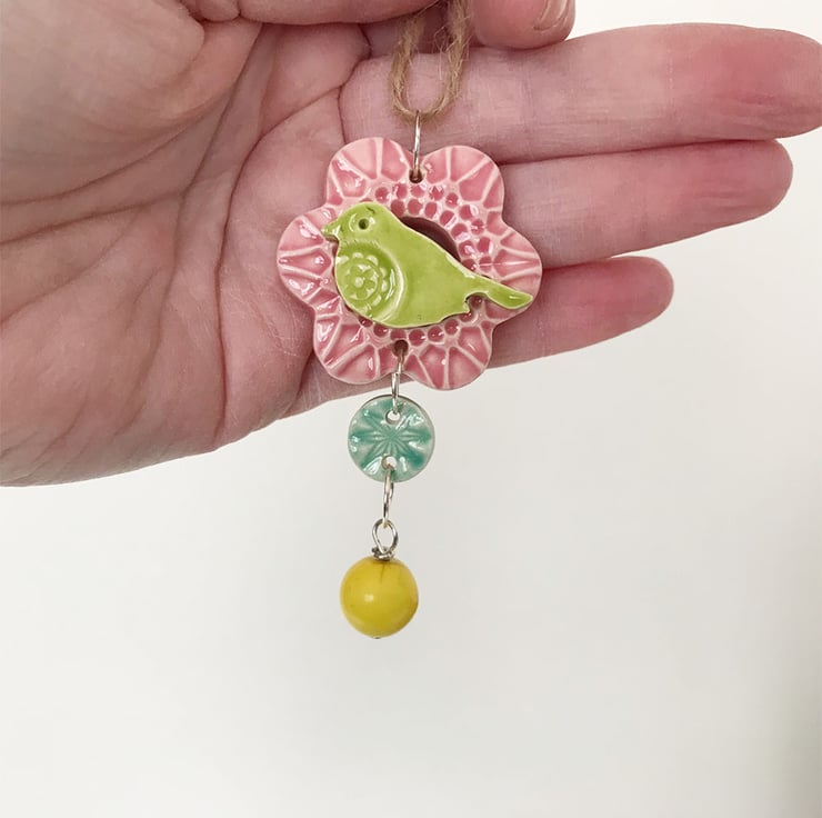 This one is reduced by £1 as the bead has a little natural dent in it but it's my last bead of this type. You can't see it that much.This titchy little pottery bird decoration is made from white earthenware clay and glazed in a rich, glossy glazes. You could use it as a hanging decoration or you could use one of your own chains and wear it as a pendant. It will come with a brown string (necklace not supplied). It measures 4.5cm diameter x 7cm long x 1cm deep. Decorated on the front only.