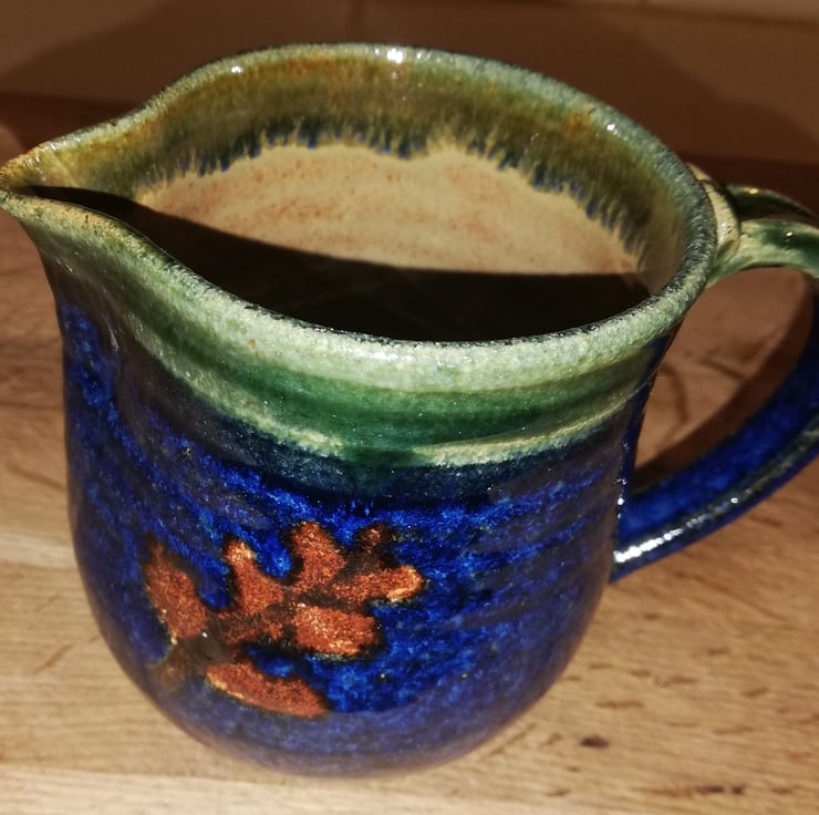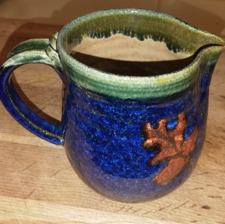 A medium-small, lovely 2 oak leaf decorations in red-brown glossy glaze either side of a mottled rich blue body with a thick line of mos green on the top 1/2'' or 10cm