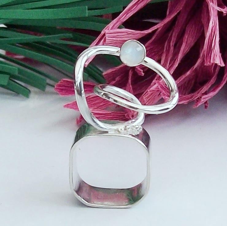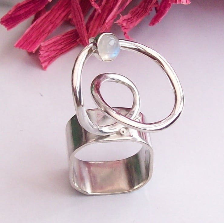 A handmade Ring, I made this ring from Sterling Silver Sheet and wire, I wanted to create a fun piece, a piece with movement and once created i chose a wonderful rainbow Moonstone as the gem, the white and the flash of luminous blue just as you would the moon in the sky on those special occasions.