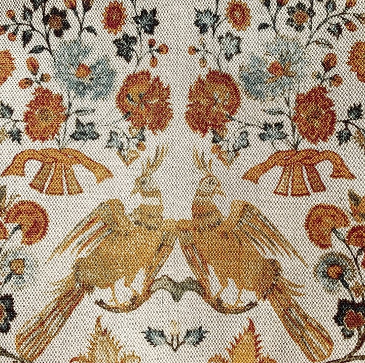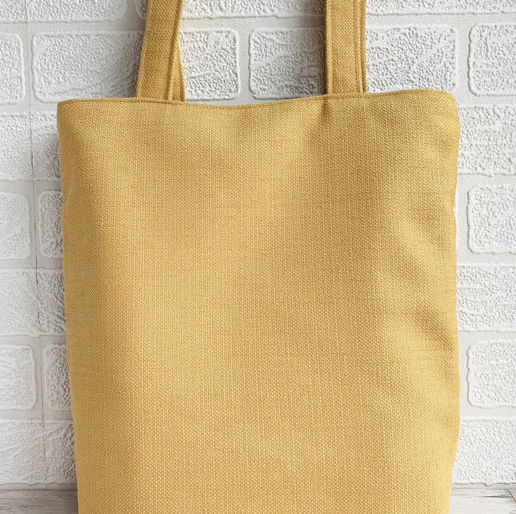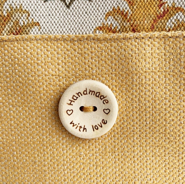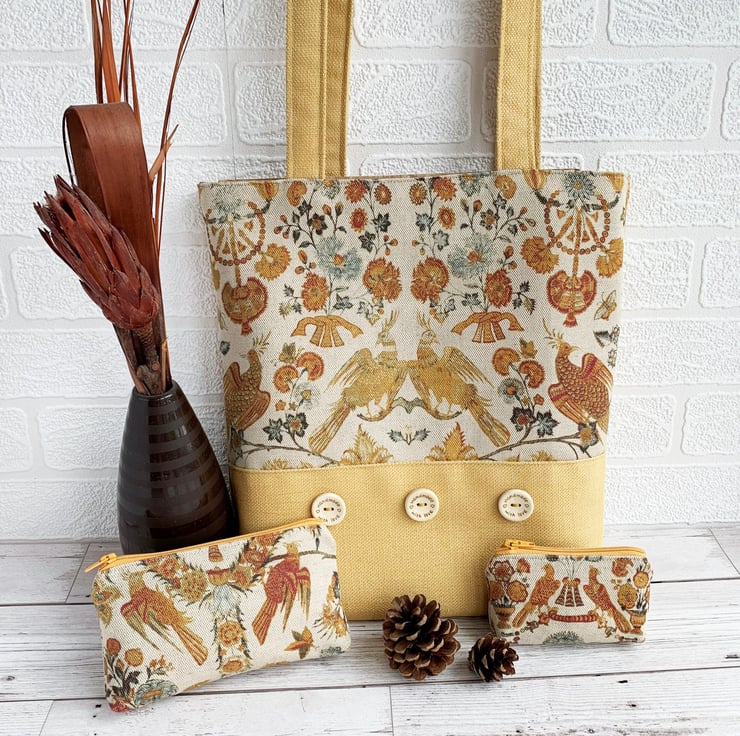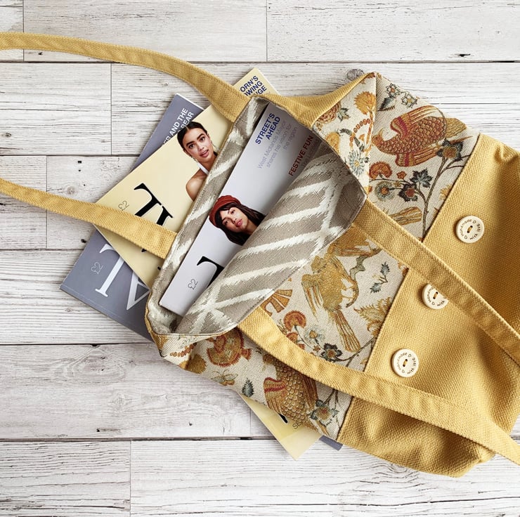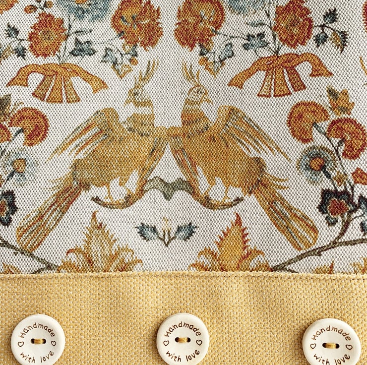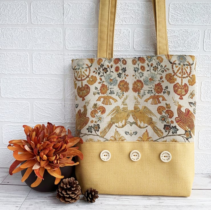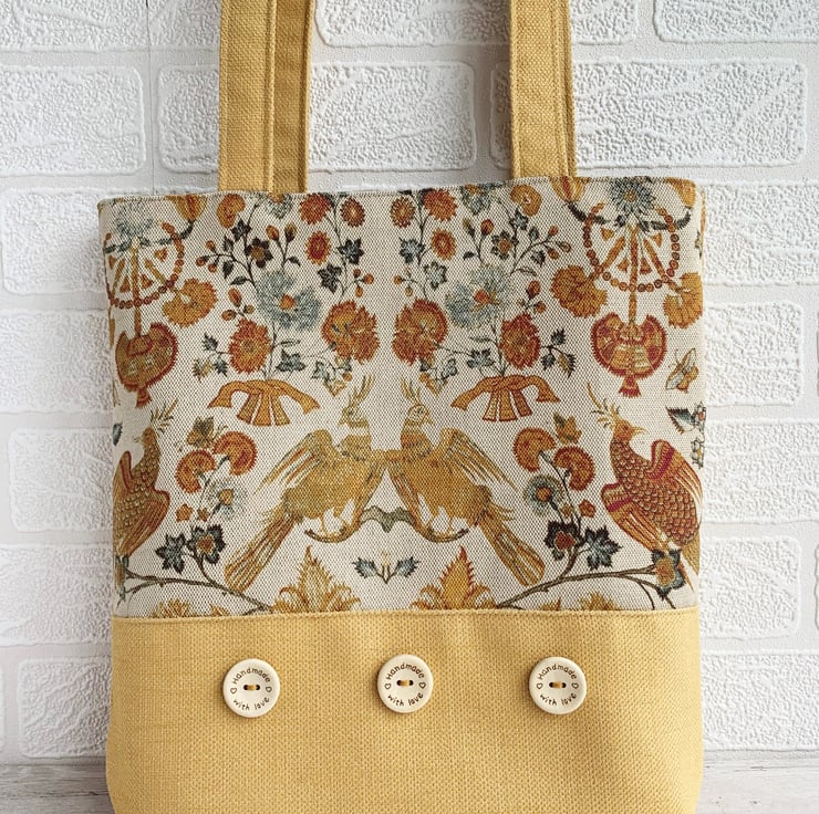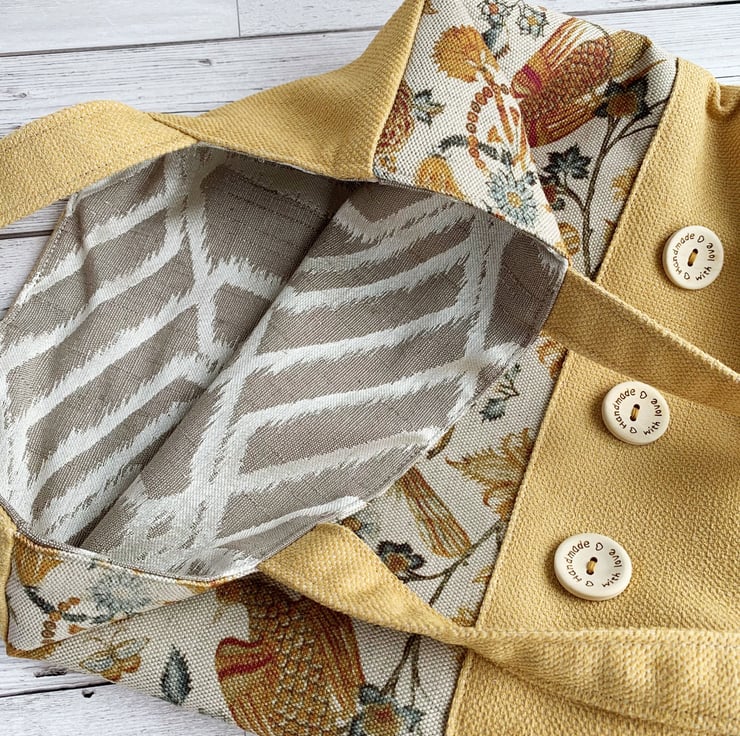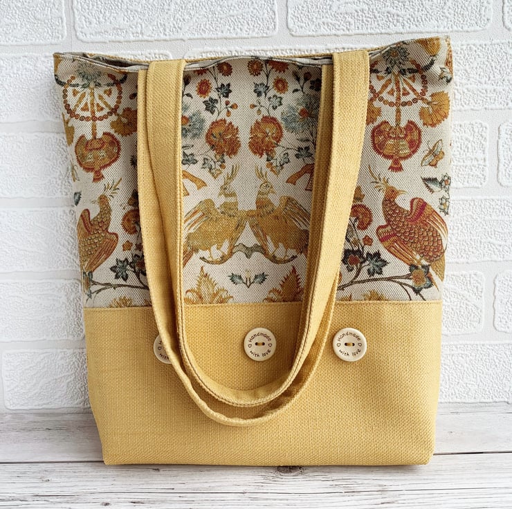 A stylised birds and flowers motifs tote bag in two fabrics. The upper front section of the bag is made from an unusual print canvas fabric with a symmetrically arranged pattern of motifs featuring eagle-like birds, flowers, branches, butterflies and bows. The pattern is in lovely warm shades of golden-yellow and burnt orange, with touches of magenta, blue and grey, on a cream background. The lower front section of the tote bag, the whole of the back, and the handles are made from a lovely golden-yellow, slightly textured fabric. Below the patterned section of the front, I have added three wooden buttons. The buttons are natural wood colour and are engraved with the words "Handmade with love" and two tiny hearts. The bag is lined with beige fabric with a woven geometric pattern of shiny cream lines.