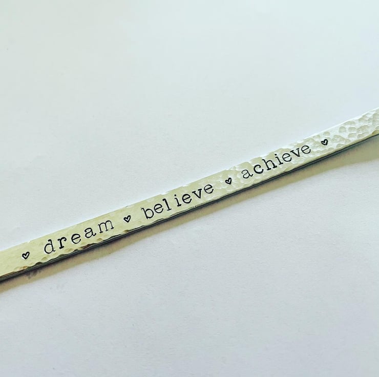 Aluminium cuff bangle hammered and stamped with ‘dream, believe, achieve’