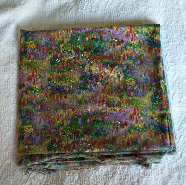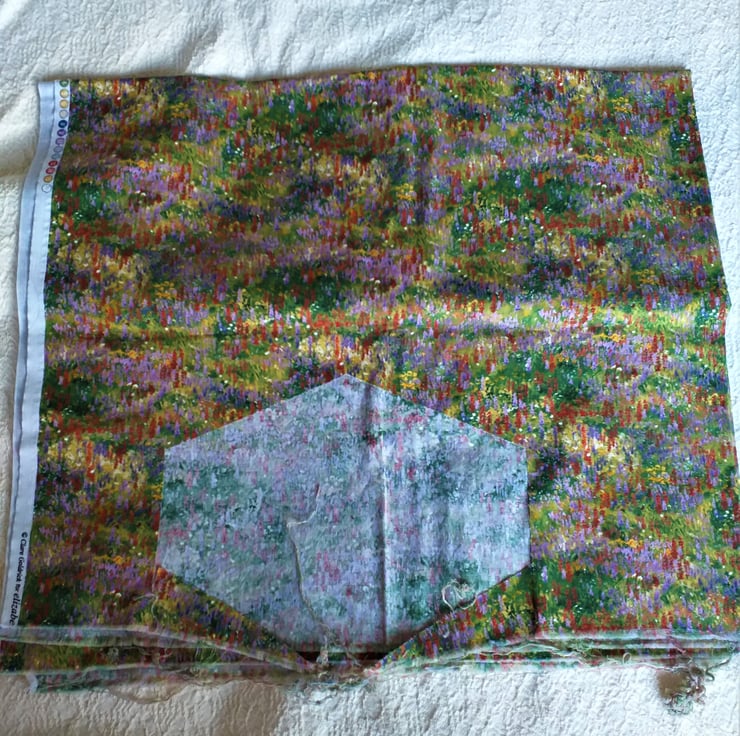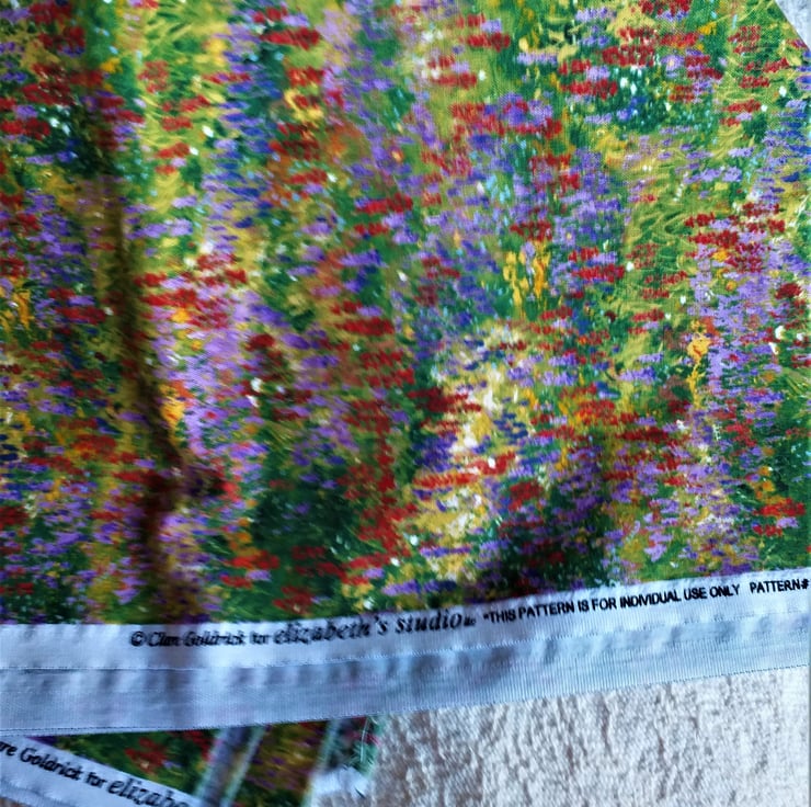 This is 1 yard (92cm.) of very pretty floral American cotton quilting fabric 40" (1 metre approx.)wide. It has an elongated hexagon 8" (20cm.) deep and 11" (28cm.)wide cut out of one end. (see photo) According to the information on the selvedge the design is the copyright of Clare Goldrick for Elizabeth Studio, and is for individual use only.