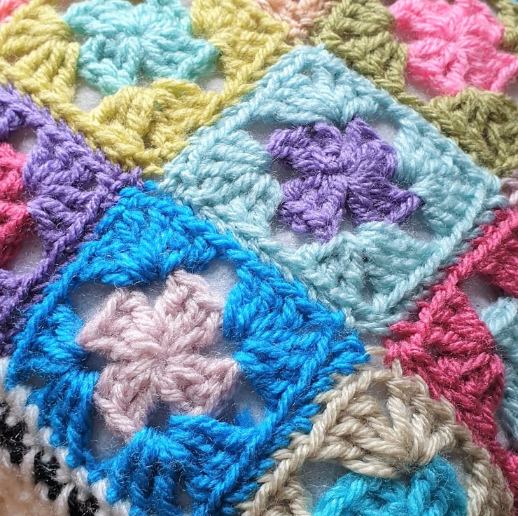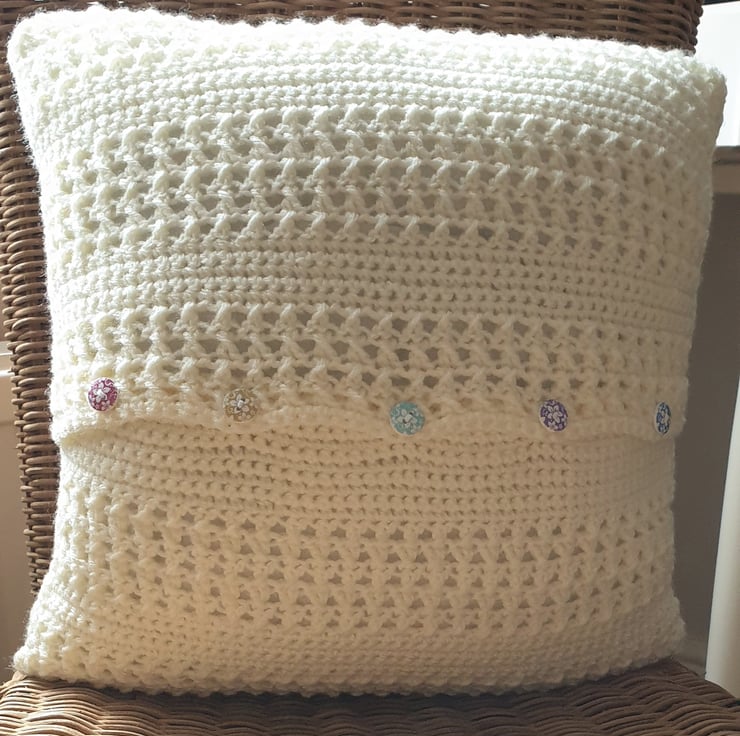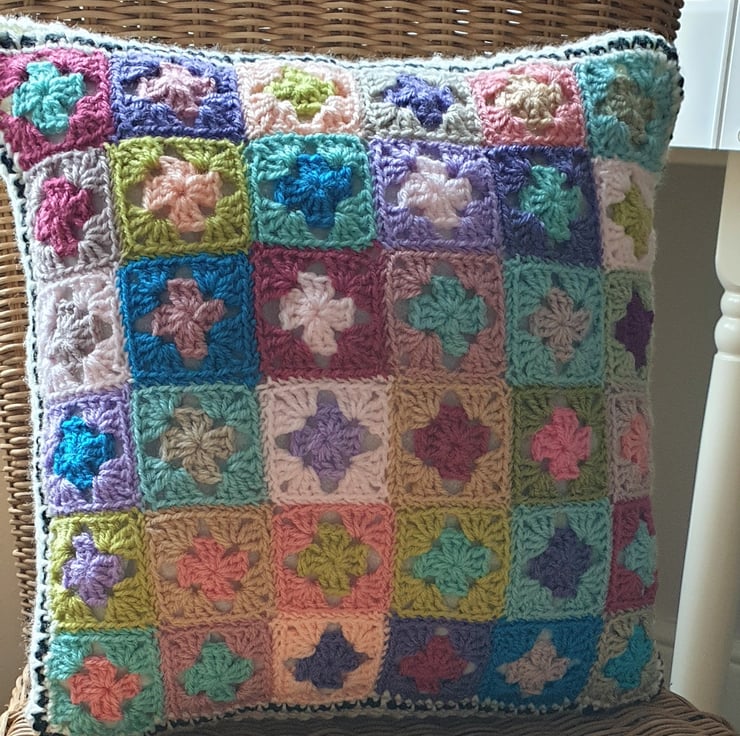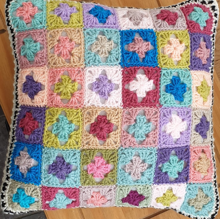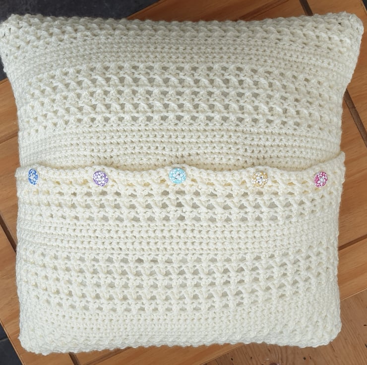 Handmade crochet cushion cover, small multi coloured squares hand stitched together with a black and cream border. A mix of cross over treble and plain treble stitches in cream back to create the reverse of the cushion with pretty coloured floral decorated buttons. I use acrylic yarn so the cover is washable, I recommend by hand or on a gentle washing machine cycle - pop the cover into a laundry bag/pillow case and dry flat.