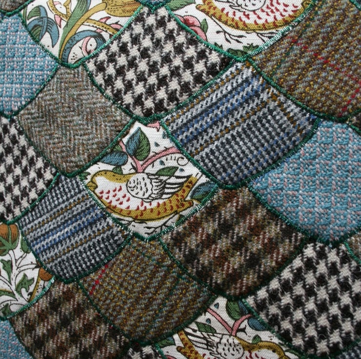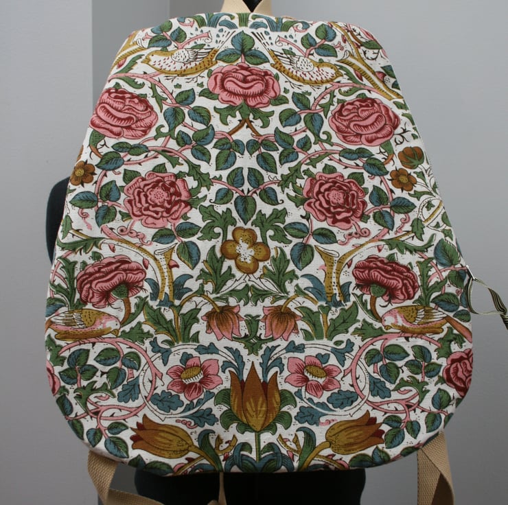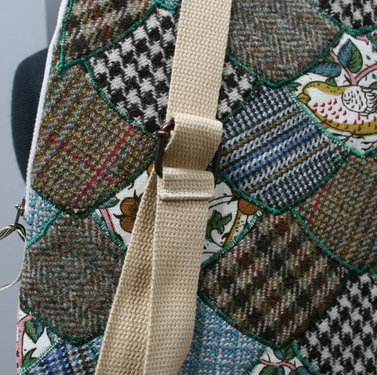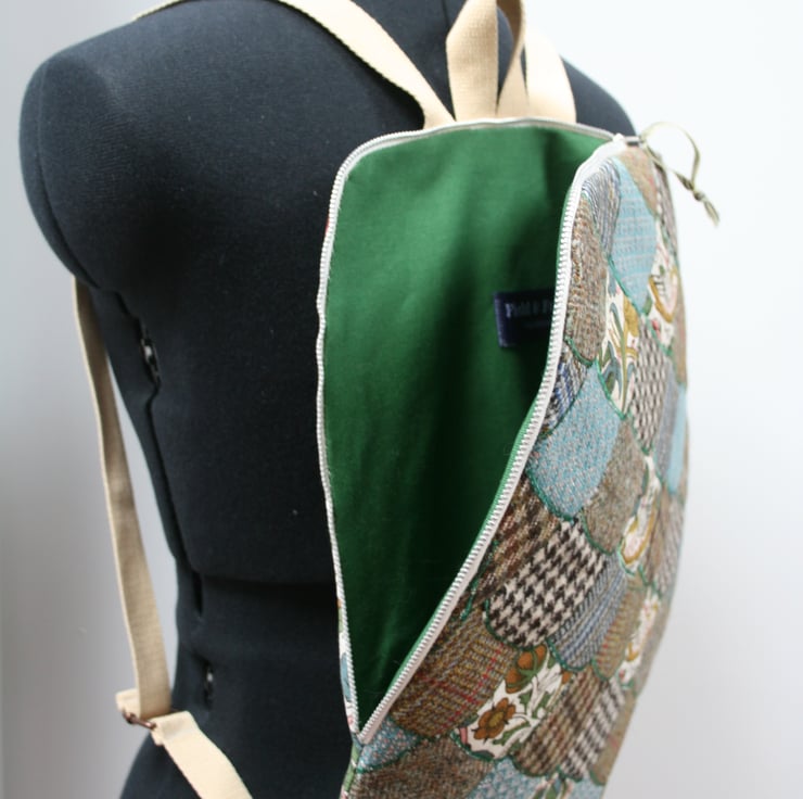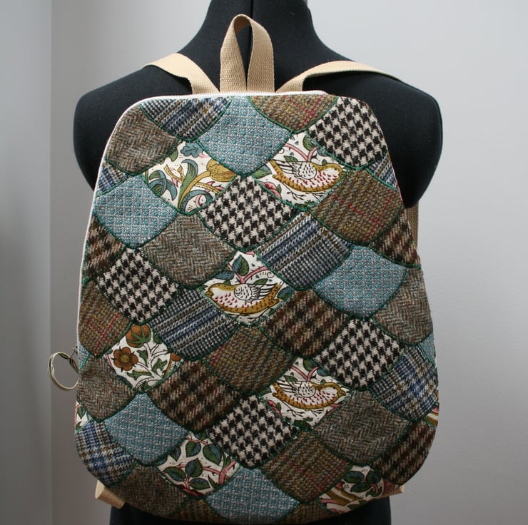 This backpack was so much fun to make and is scales appliqued to create a patchwork-type pattern of multi colour dragon scales (or mermaid scales, or fish scales if you prefer!). A lovely range of colours and textures, using offcuts of vintage wool tweeds in various colours and vintage curtain fabric (the white with flower/bird patterns. Shown on an adult size mannequin.