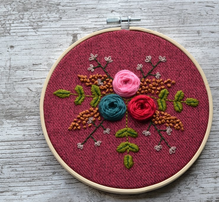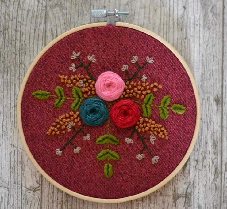 Free hand embroidered wall hanging. Light wooden hoop with a lovely plum colour fabric which has a darker shade of plum fleck running through the fabric. Embroidered with flowers, blossom and leaves. Measures 15.5cm across. Looks lovely when hung on a wall.