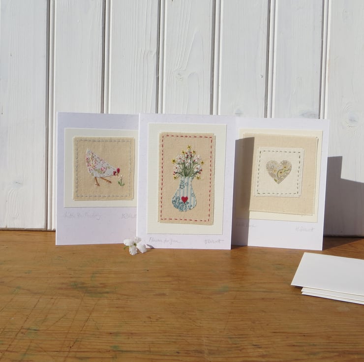 The titles of the cards are: Little Hen Pecking, With Love and Flowers for You. I have teamed my own hand-dyed recycled cottons with pretty cotton prints to make unique miniature textiles.