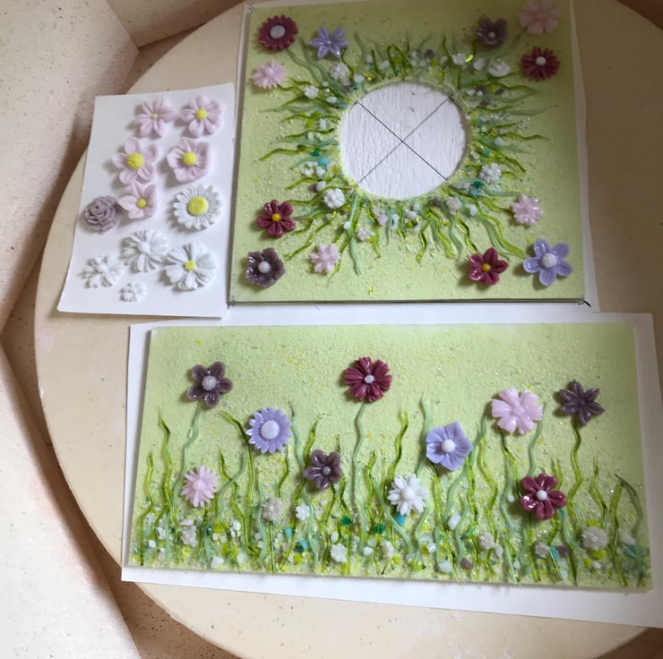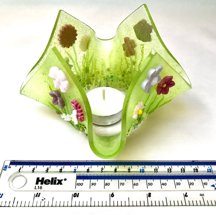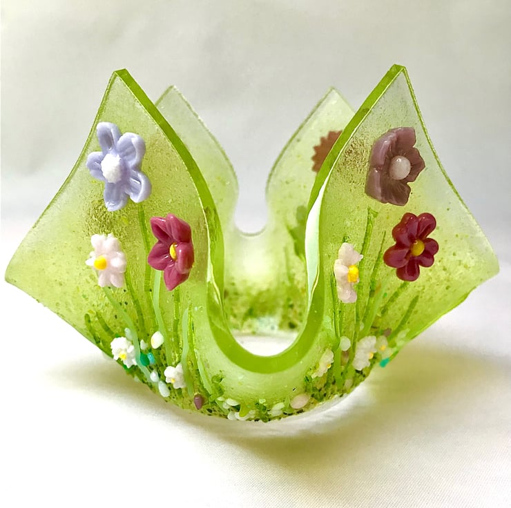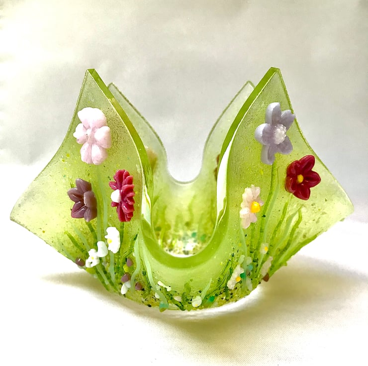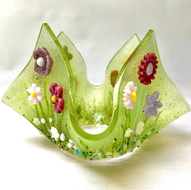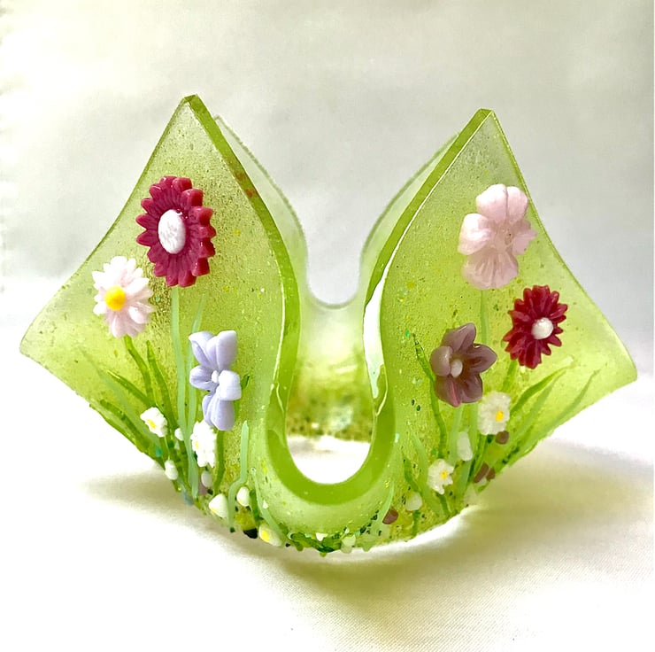 This lovely wild flower candle holder is the result of 3 firings in the kiln. First, the flowers were created from powdered glass and moulded into shape and fired to 740 degrees Celsius. The strands of grass were shaped by hand using strings of glass and a candle. Then a 15cm base of clear gass was cut, sprinkled with glass powder and hand crushed glass frit. The grass and flowers were then arranged and returned to the kiln for 10 hours of firing and 5 hours of cooling. Once cooled, the flat piece was returned to the kiln and draped over a vase mould to create this handkerchief folded vase which is perfect to hold the larger tea light candles.