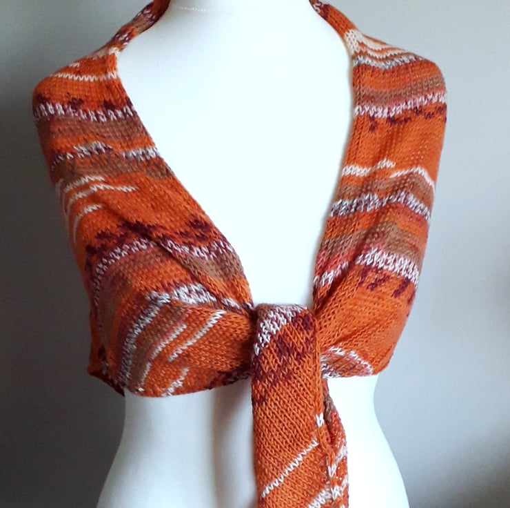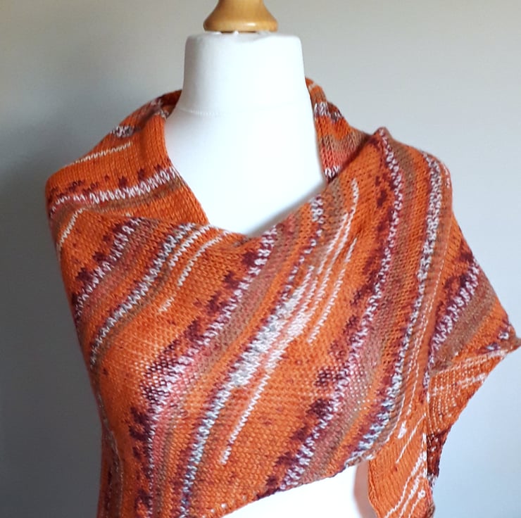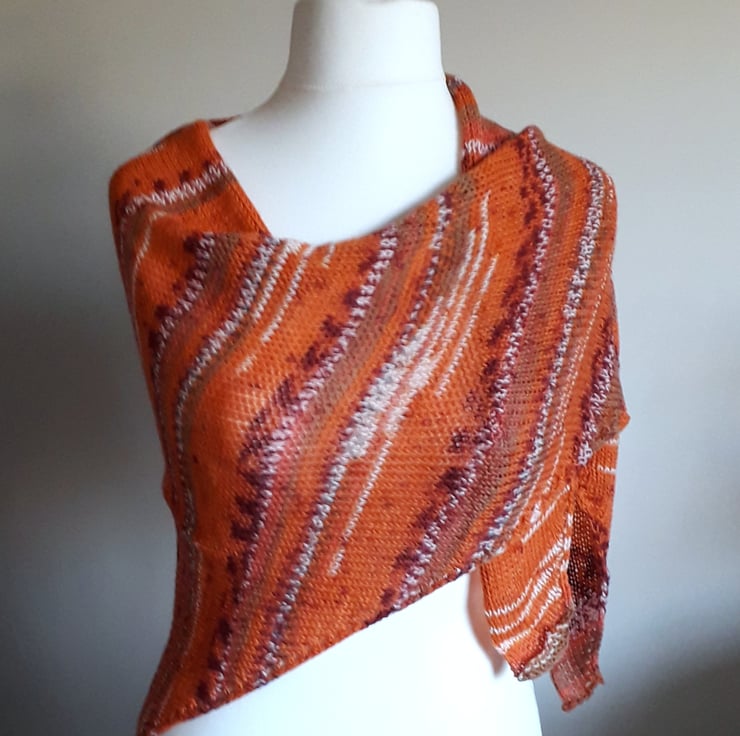 This triangular wrap will make a much loved addition to your wardrobe or a wonderful gift. It has been lovingly made on a hand operated knitting machine and features pretty eyelets along two sides for a decorative finish.
