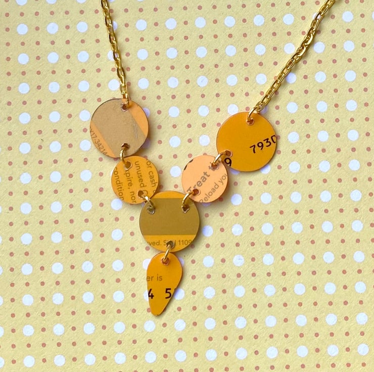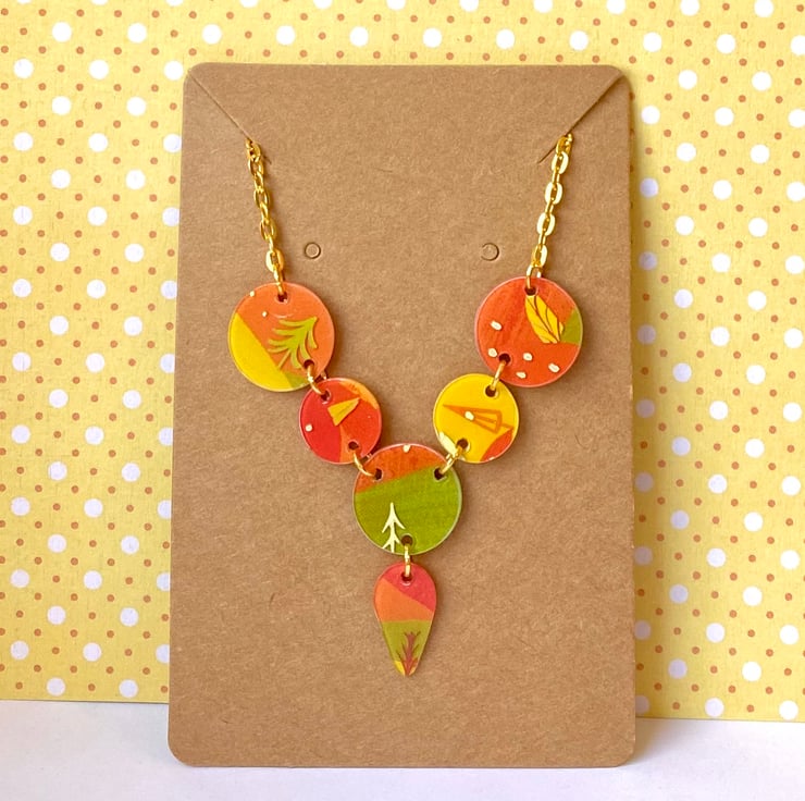 Hand cut from a Starbucks plastic gift card, this necklace is made up of five discs and a teardrop. Each piece features a vibrant design of trees and leaves on an orange, yellow and green background. Some of the detail is finished in a gold foil which catches the light nicely. Very lightweight to wear.