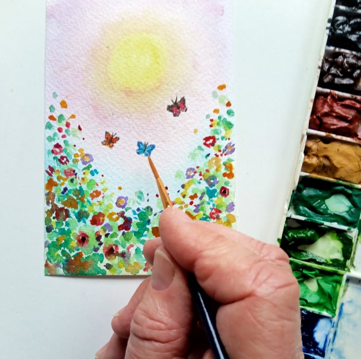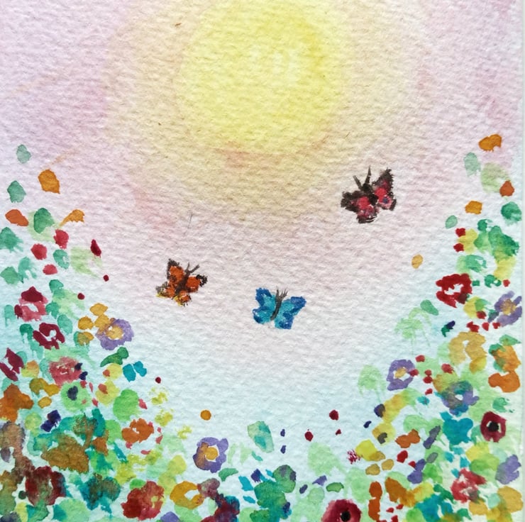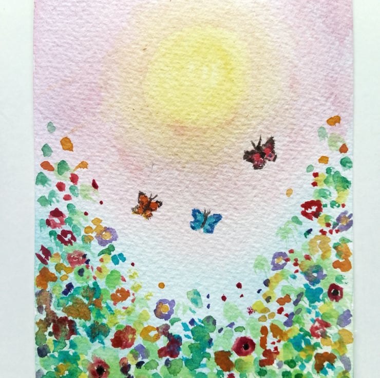A lovely miniature original painting with butterflies and a flower meadow. Soft background colours surround the sun.
