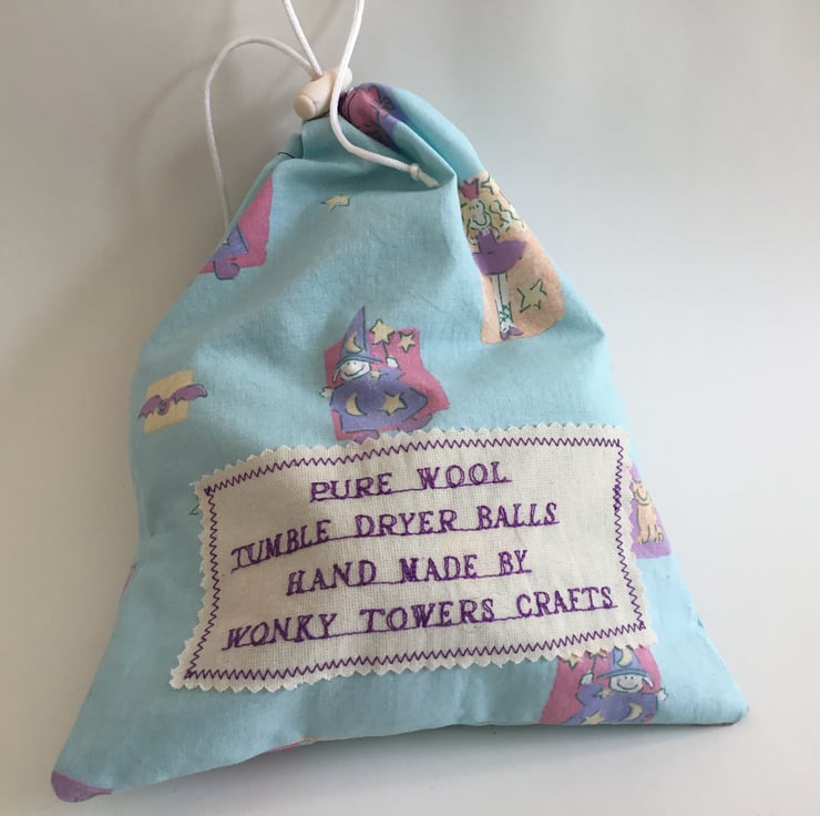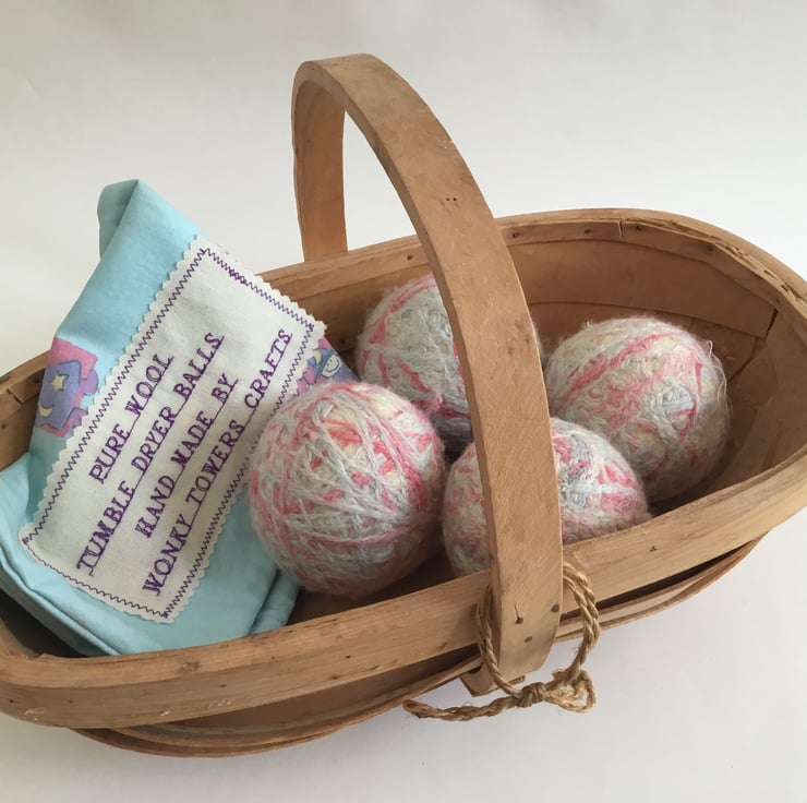I love making these and I hope you enjoy using them. These tumble dryer balls are 100% pure wool, made from a combination of raw fleece, waste wool and yarn, felted together to make a firm ball. They will not unravel, as the process makes a secure finished product. We supply sets of 3 or 4 balls in a drawstring bag. This is a set of 4 balls, decorated with a pretty, pastel merino yarn. They are supplied in a pale turquoise drawstring storage bag.