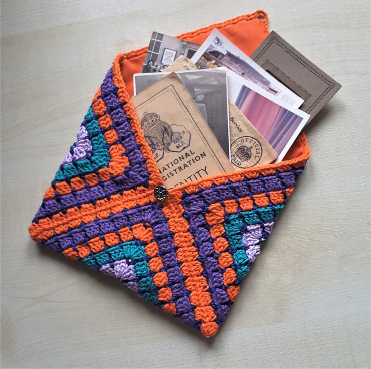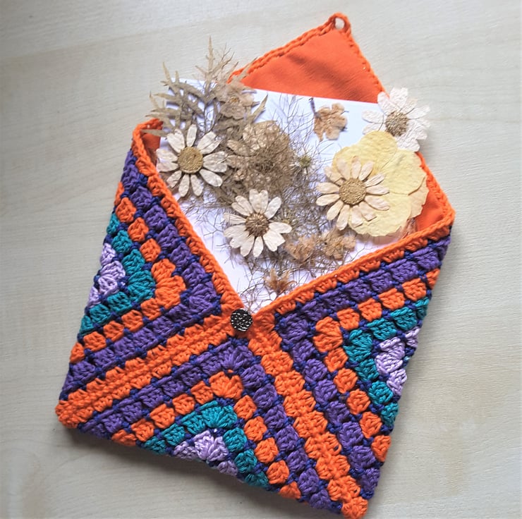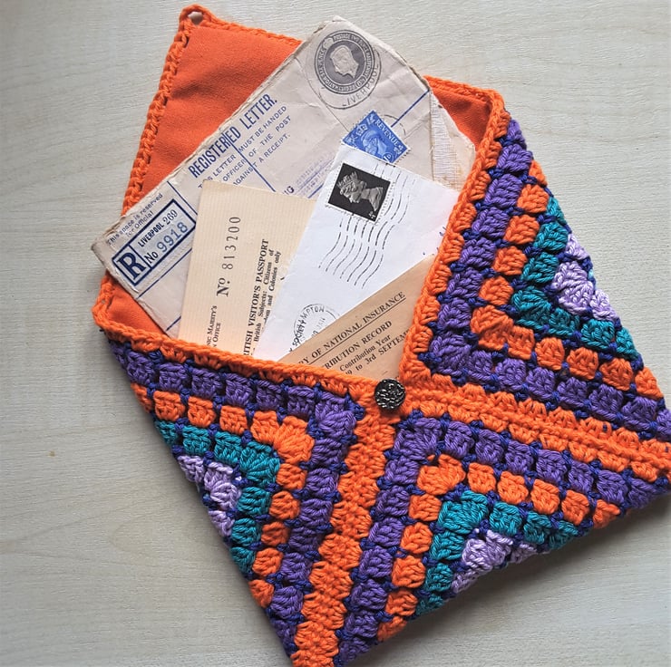 This measures 8 inches (about 20 cms) square and closes with a vintage metal button so that everything is safe inside. Finished and ready to post. I'm very happy to gift wrap and send direct.