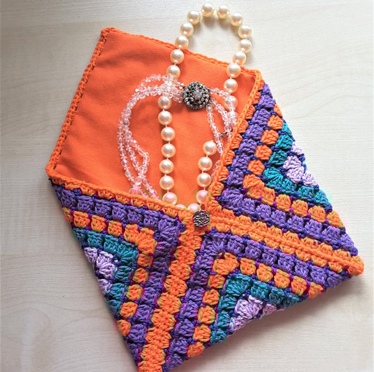 Keep your treasures and memories safe with this pretty, lined crochet pouch. Use it for all those little bits you want to keep safe but not sure where to put them. File away old photographs, love letters, press cuttings, jewellery, dried flowers, tickets etc.