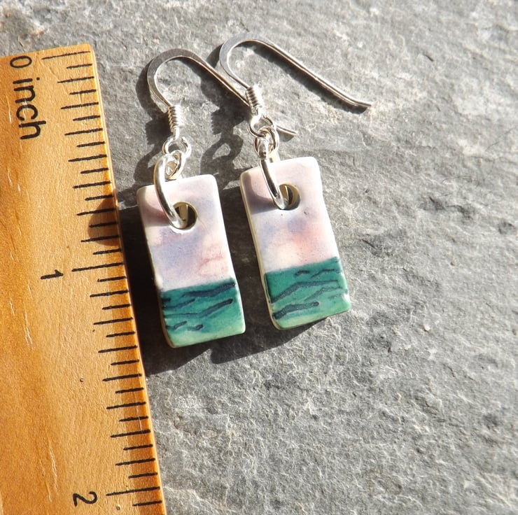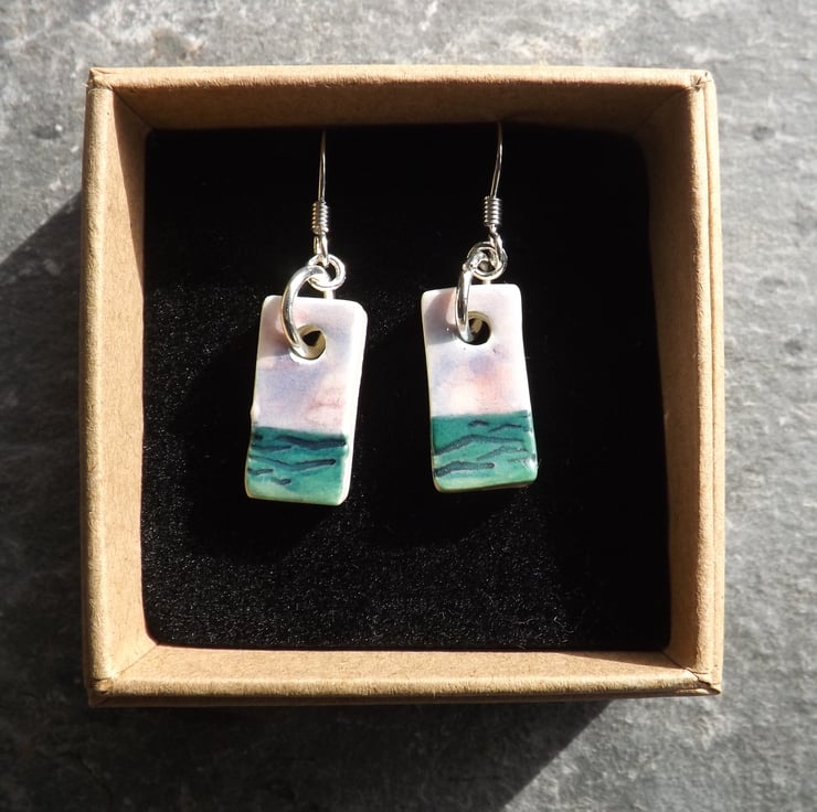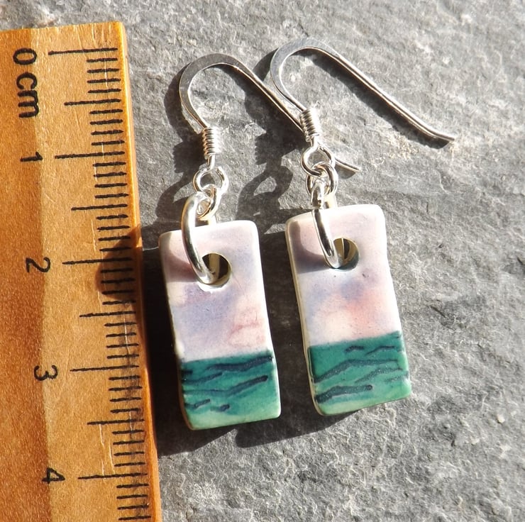 These dainty earrings have a design of waves pressed into the wet clay, which have been painted in sea green and blue, with a wash of soft blue and pink across the sky.
