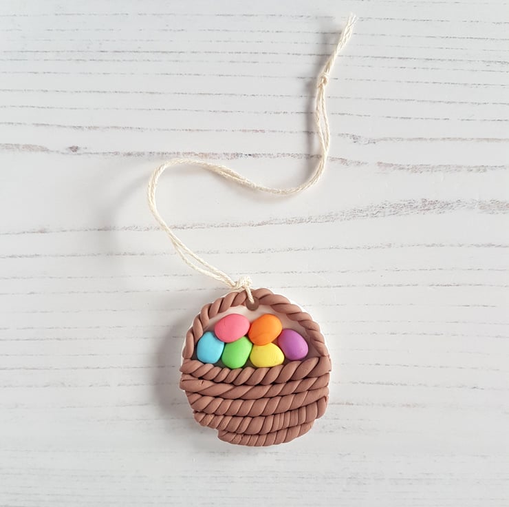 This Easter Egg Basket decoration plaque is made of polymer clay, with a woven effect for the basket and little coloured eggs popping out of the top! Perfect to add onto your own Easter basket, or to display in your home.