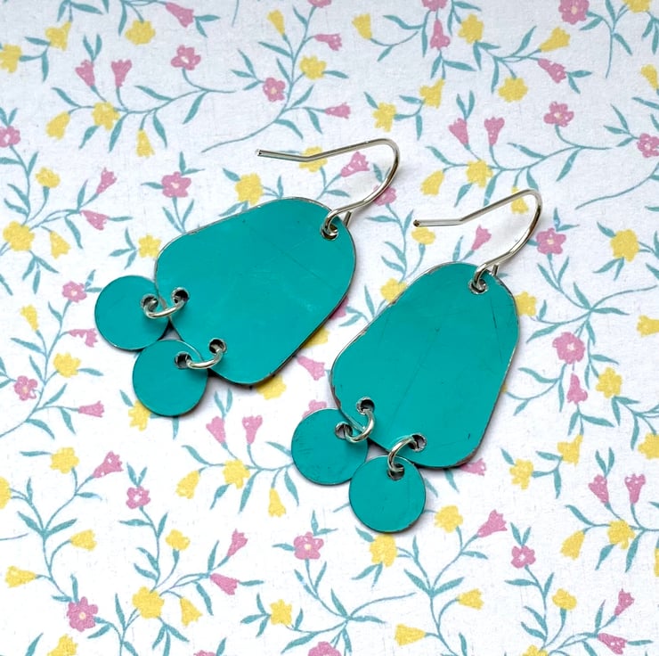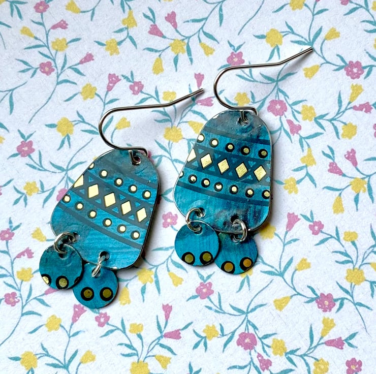 These bell shaped earrings were once part of a vintage Baret Ware Ambrosia tin cocktail tray. The pieces have been hand cut, shaped and smoothed around the edges. They feature a gold diamond and circle pattern on a turquoise blue background and matching disc drops.