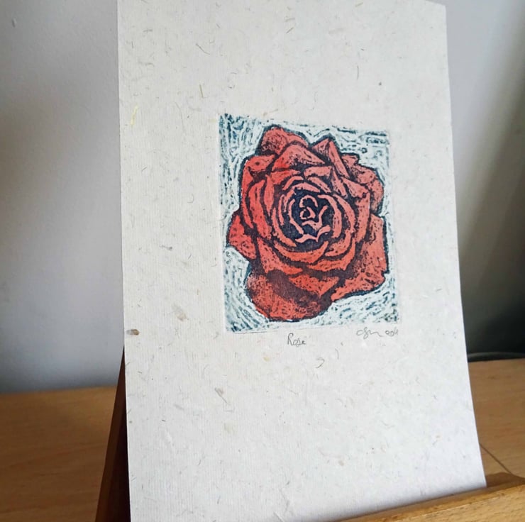 Original collagraph print with watercolour wash on thin hand-made paper with tiny leaves embedded in it.