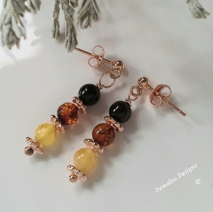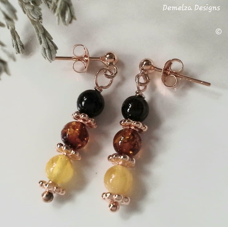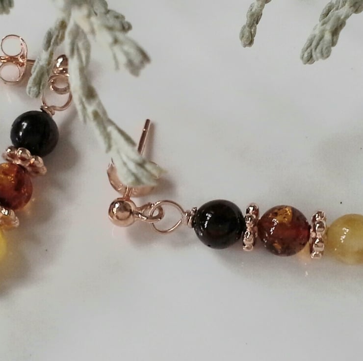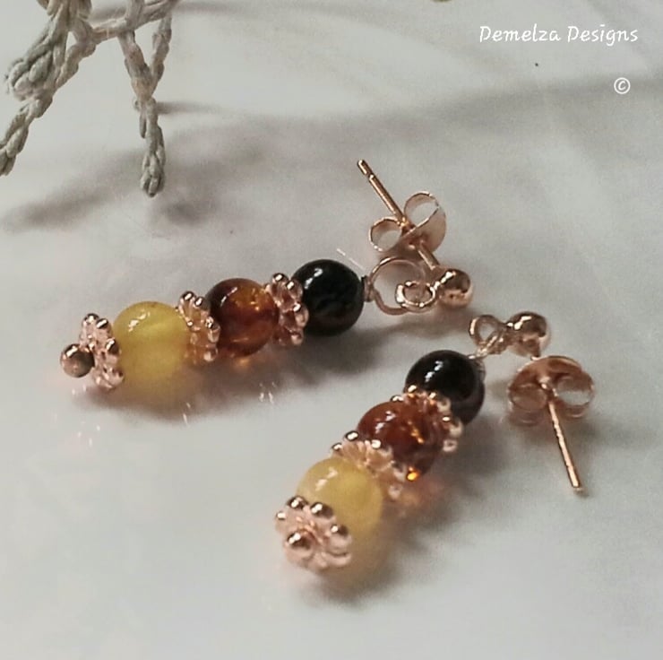 A very warm glowing dainty pair of earrings designed and hand crafted using 6mm cut genuine Baltic amber multicoloured rounds. All other components are rose gold vermeil over 925 sterling silver. All Demelza Designs findings are purchased from either their supplier's based in Birmingham or the London jewellery quarters whom are registered with the National Association of jewellers (NAJ) within the trade.