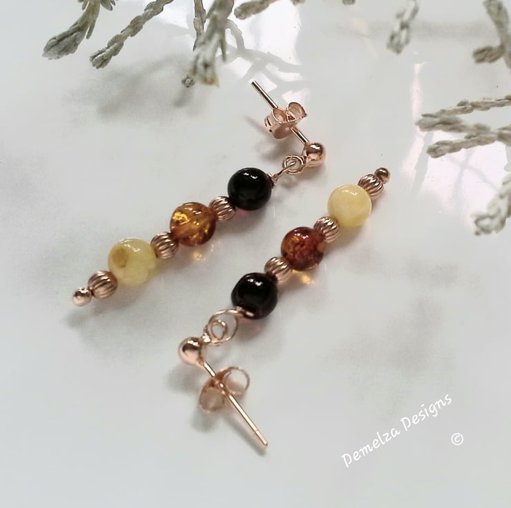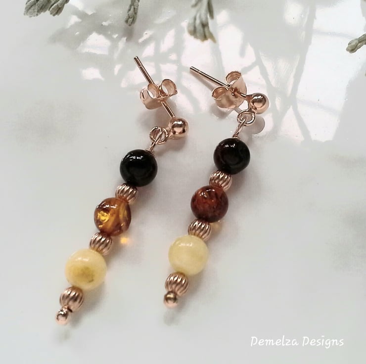 A very warm glowing dainty pair of earrings designed and hand crafted using 6mm cut genuine Baltic amber multicoloured rounds. All other components are rose gold vermeil over 925 sterling silver. All Demelza Designs findings are purchased from either their supplier's based in Birmingham or the London jewellery quarters whom are registered with the National Association of jewellers (NAJ) within the trade.