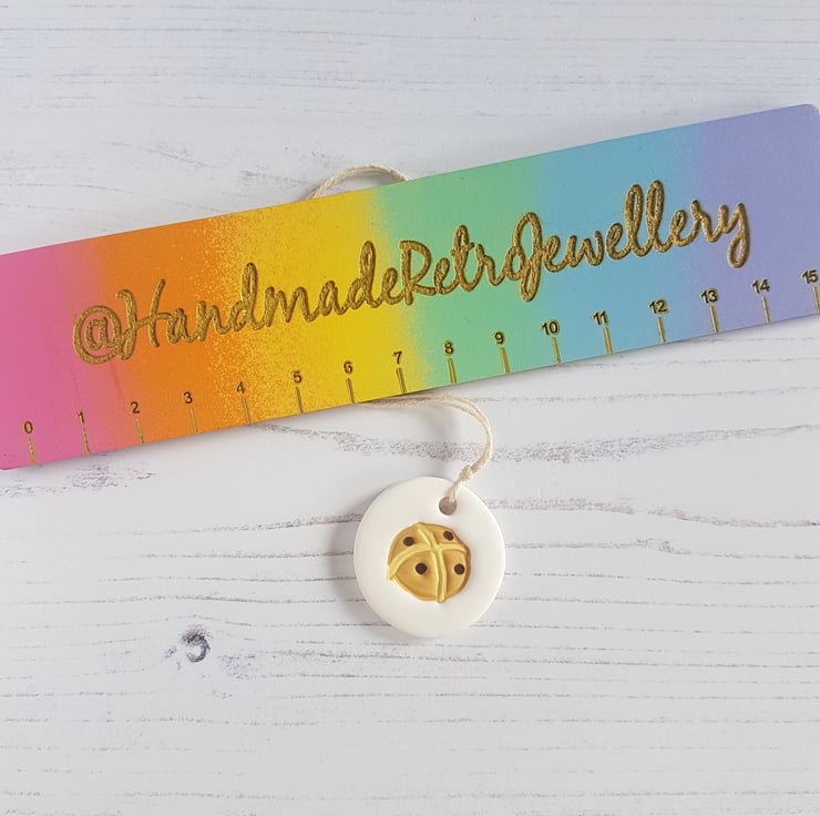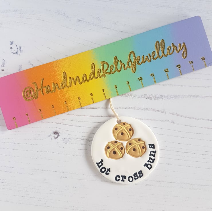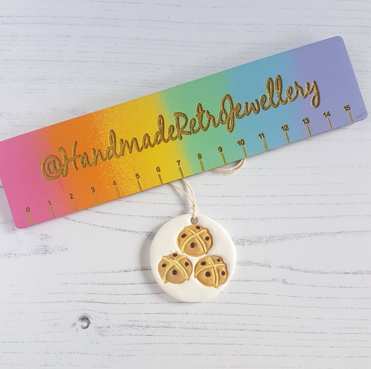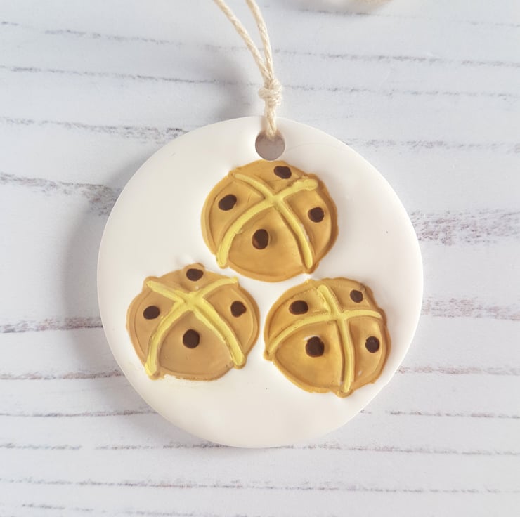 This Hot Cross Bun decoration is made of polymer clay, with small little buns with currants hand stamped into the clay, then hand painted with paints to finish!