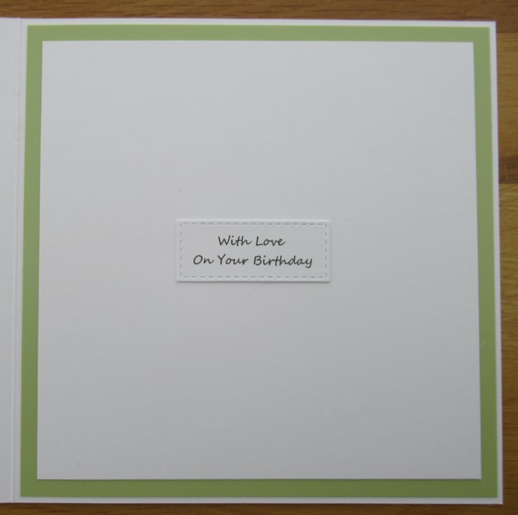 A pretty green and brown card featuring the cute image of two hedgehogs sat on a sofa with a hot drink and a plate of friendship cookies. It has soft green and brown backgrounds which have been cut using decorative frilled edge dies. The inside has been finished to coordinate with a 'With Love on your Birthday' greeting.