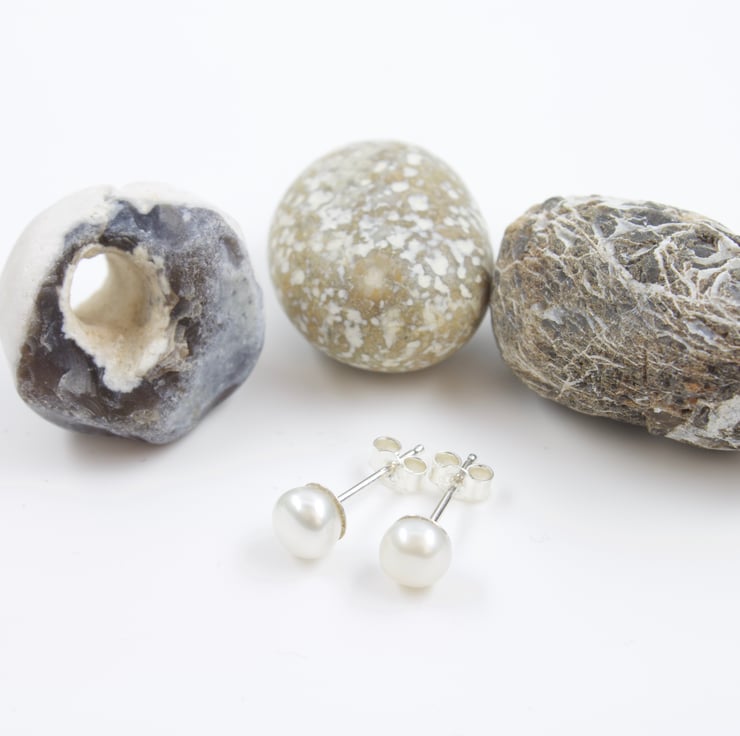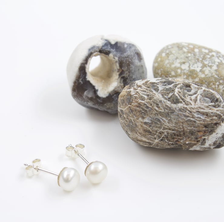 These white freshwater button pearls have been half drilled and set on sterling silver stud fittings. They are a lovely creamy white colour and have the advantage of not being so deep as a round pearl due to their button shape and therefore sit more easily on the ear.