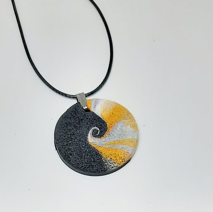 Unique swirl design patterned pendant with a textured finish created with polymer clay.