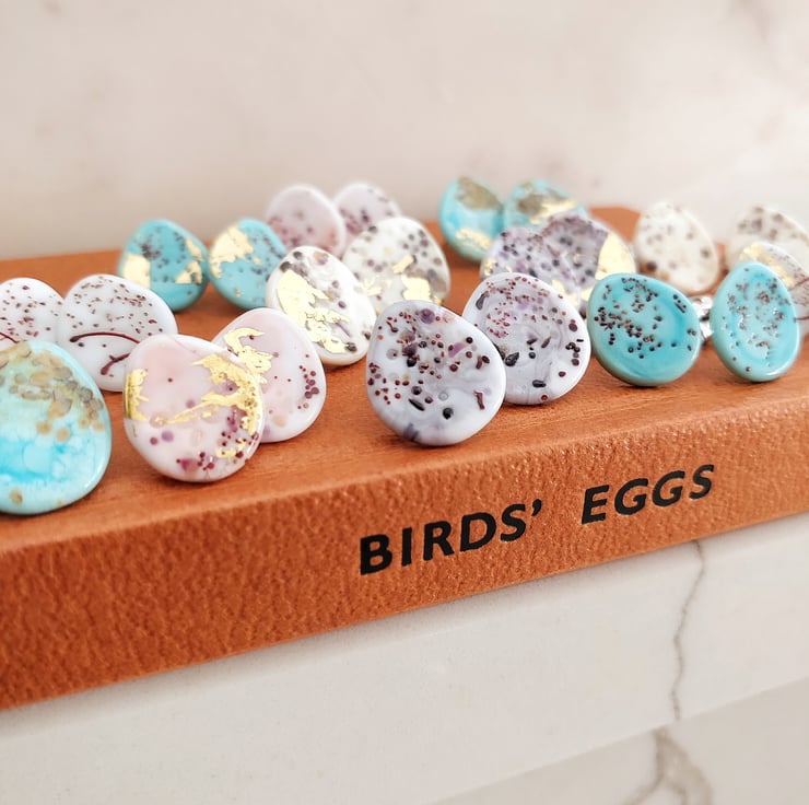 Pictured are a pair of statement glass studs that have evolved from my watercolor impressions of British bird eggs.