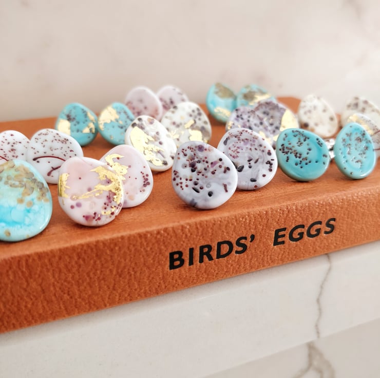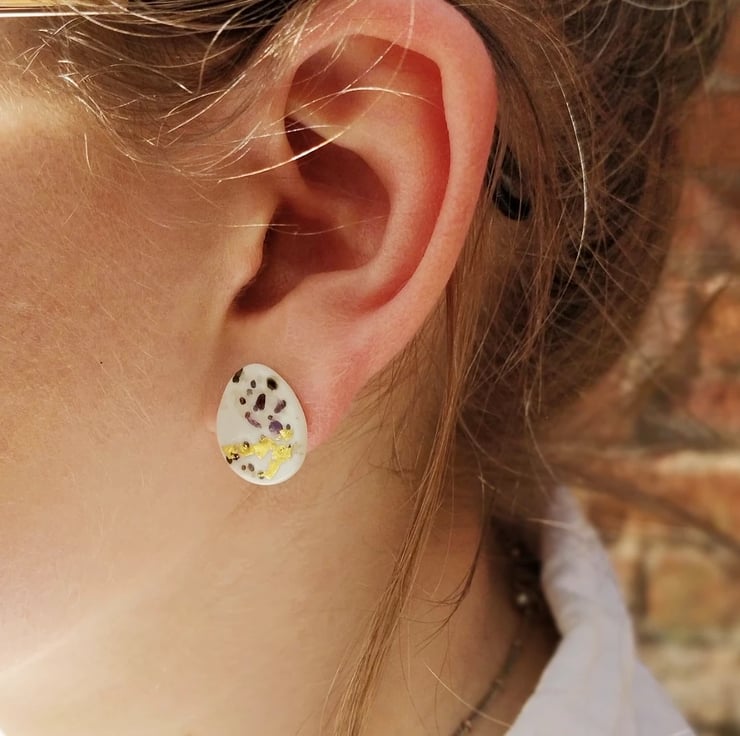 Pictured are a pair of statement glass studs that have evolved from my watercolor impressions of British bird eggs
