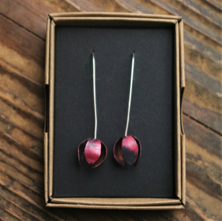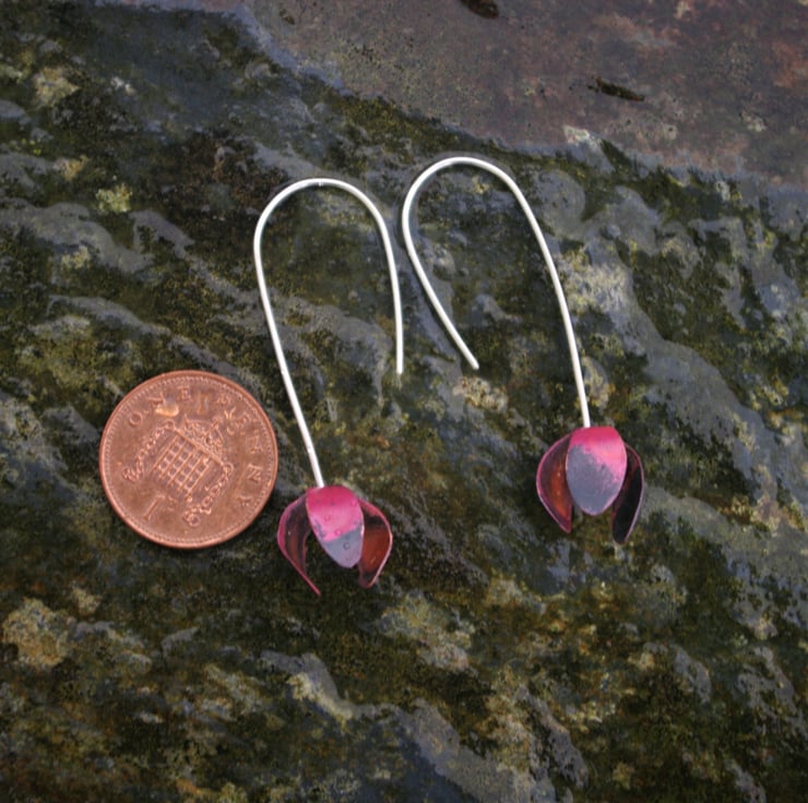 Inspired by petals, these are copper flower earrings, cut from one piece of copper. They hang from a sterling silver, handmade ear hook with a pleasing blob of silver at the end which stops the piece from falling off and marks the centre. Each petal is about 13mm long and about 6mm wide . I have cut the shapes by hand with a piercing saw ; making each pair of earrings unique. The colour variations are made with heat and will remain as they are as they are protected with a penetrating wax.